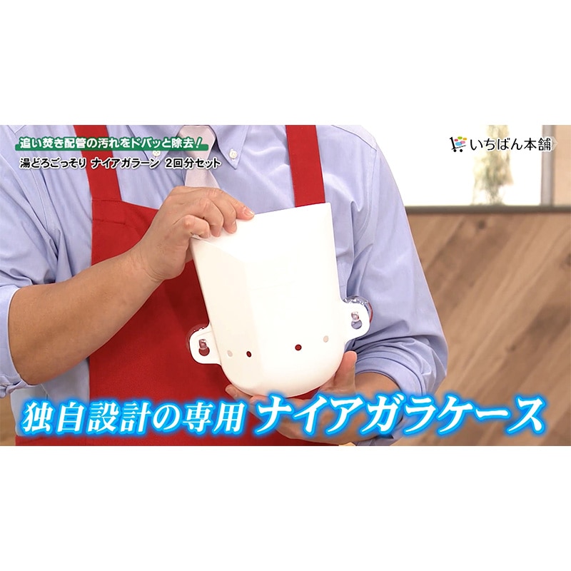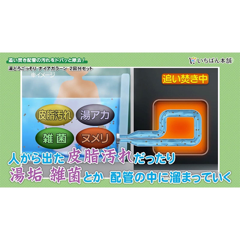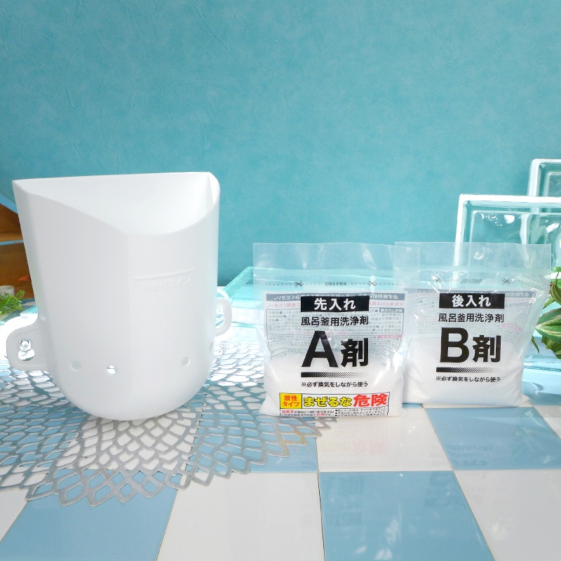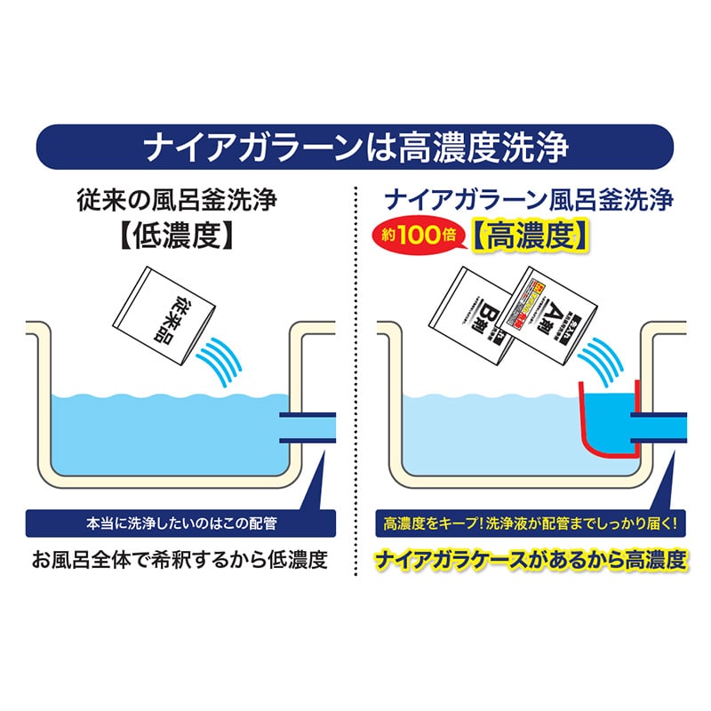 業者が使用する洗浄剤をベースにさらに洗浄力を高くし、どなたでもご家庭で簡単に追い焚き配管掃除をできるようにしました。 A剤が汚れに浸透、分解し、B剤がその汚れを一気に掻き出し、配管に付着している水アカや皮脂汚れ、雑菌などの様々な汚れをしっかり洗浄します。 従来の、浴槽全体にためた水に洗浄剤を拡散する洗浄方式とは異なり、「ナイアガラーン」は付属のナイアガラケース内の少量の水に洗浄剤を入れるので、従来より約100倍も高濃度な洗浄剤で配管を洗浄することができます。 それにより、これまで落としきれなかった汚れもしっかりと落とします。 また、お湯のにおいの原因となる雑菌も99%除菌します。 洗浄剤には配管保護成分も配合し、配管を傷めにくくしております。