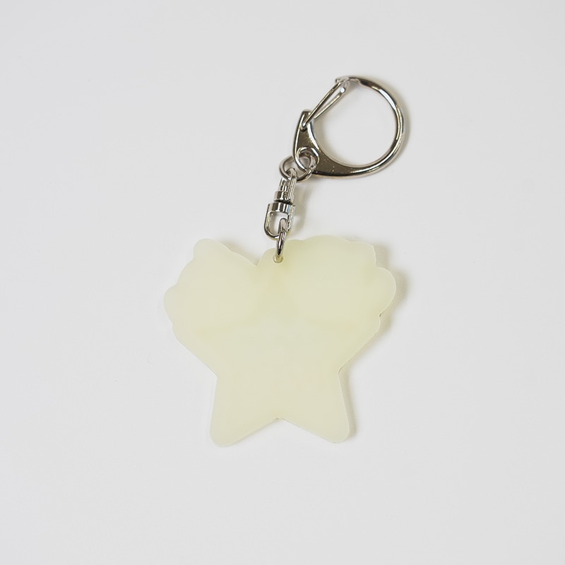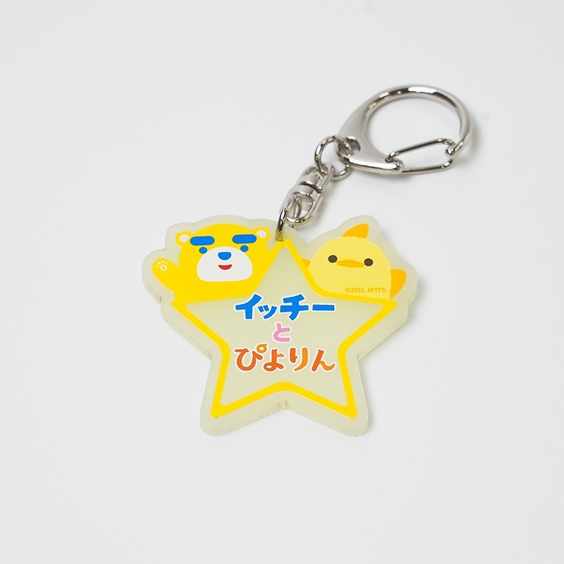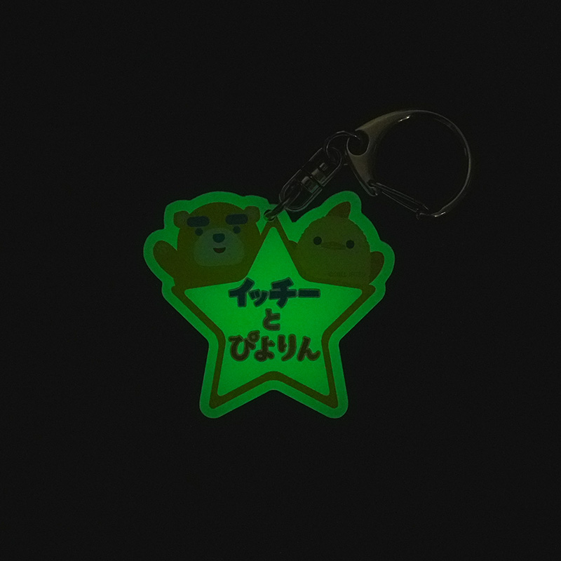 2025年度版イッチーとぴよりんコラボキーホルダー。 イッチーとぴよりんがお星さまに乗りました! 目印にもピッタリ、暗いところで光る、蓄光タイプのキーホルダーです。