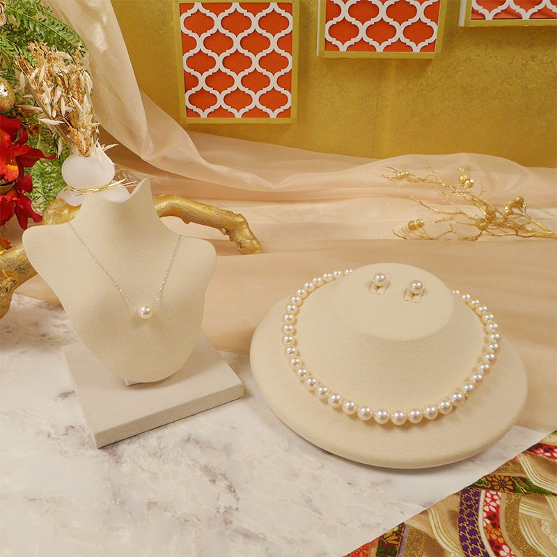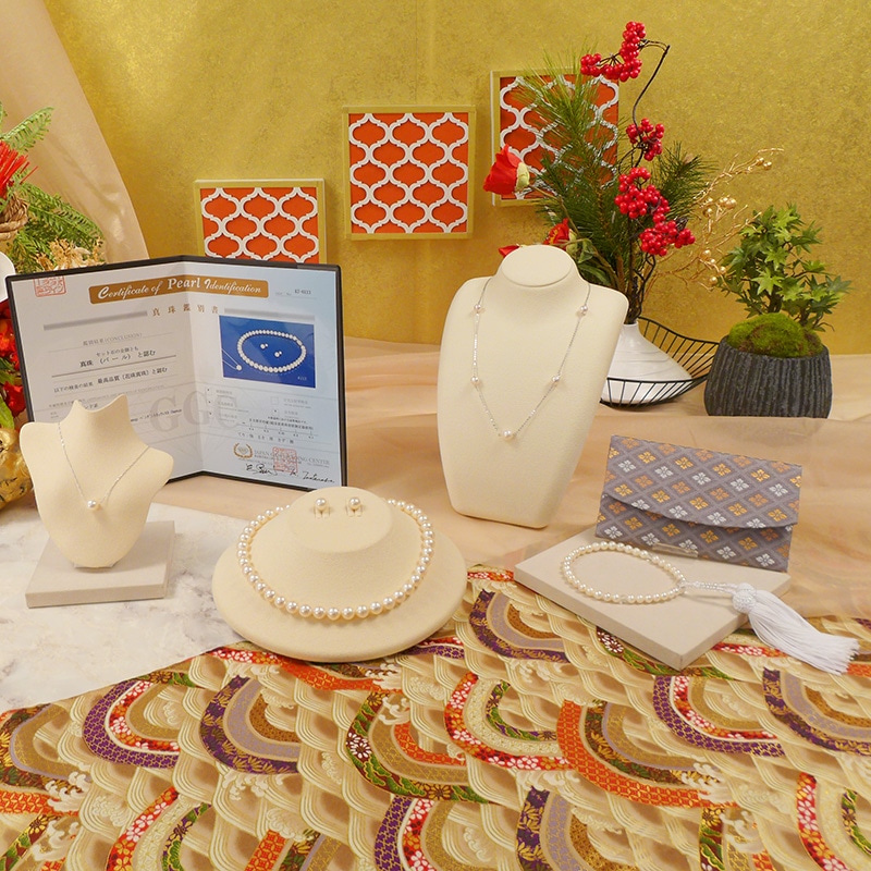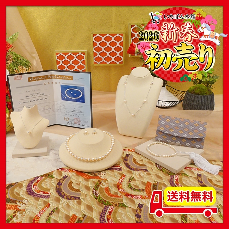 いちばん本舗で大人気の伊勢志摩産本真珠から、1年ぶりのご紹介! 花珠本真珠を使用した3点セットをご紹介。 「花珠」は「テリ・巻き・形・傷の少なさ」の評価で高い基準を満たした真珠にだけ与えられる特別な称号です。 そんな花珠本真珠の超大珠9-9.5mmを使用したネックレス、イヤリング又はピアス、ペンダントの3点セットにしてご用意いたしました。 また今回は伊勢志摩産の本真珠を使用したステーションネックレス、必需品の念珠、念珠ケースもお付けし、合計6点セット!! セット使いはもちろん、単体でも使用できるジュエリーをセットにした新春特別セットです!