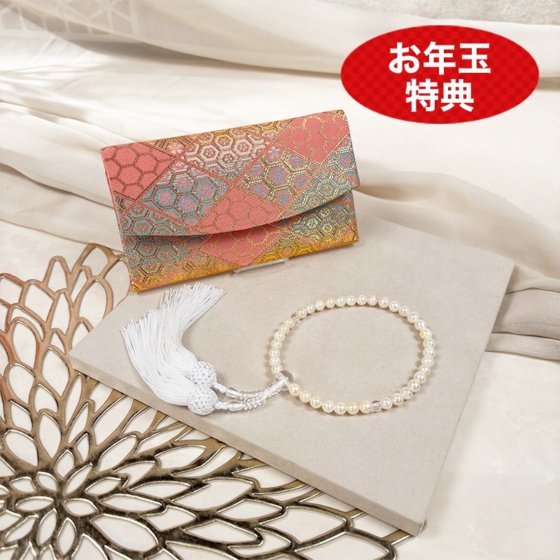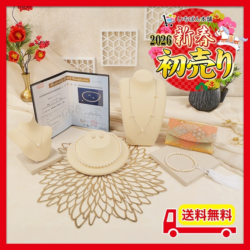 いちばん本舗で大人気の伊勢志摩産本真珠から、1年ぶりのご紹介! 花珠本真珠を使用した3点セットをご紹介。 「花珠」は「テリ・巻き・形・傷の少なさ」の評価で高い基準を満たした真珠にだけ与えられる特別な称号です。 そんな花珠本真珠の大珠8-8.5mmを使用したネックレス、イヤリング又はピアス、ペンダントの3点セットにしてご用意いたしました。 また今回は伊勢志摩産の本真珠を使用したステーションネックレス、必需品の念珠、念珠ケースもお付けし、合計6点セット!! セット使いはもちろん、単体でも使用できるジュエリーをセットにした新春特別セットです!