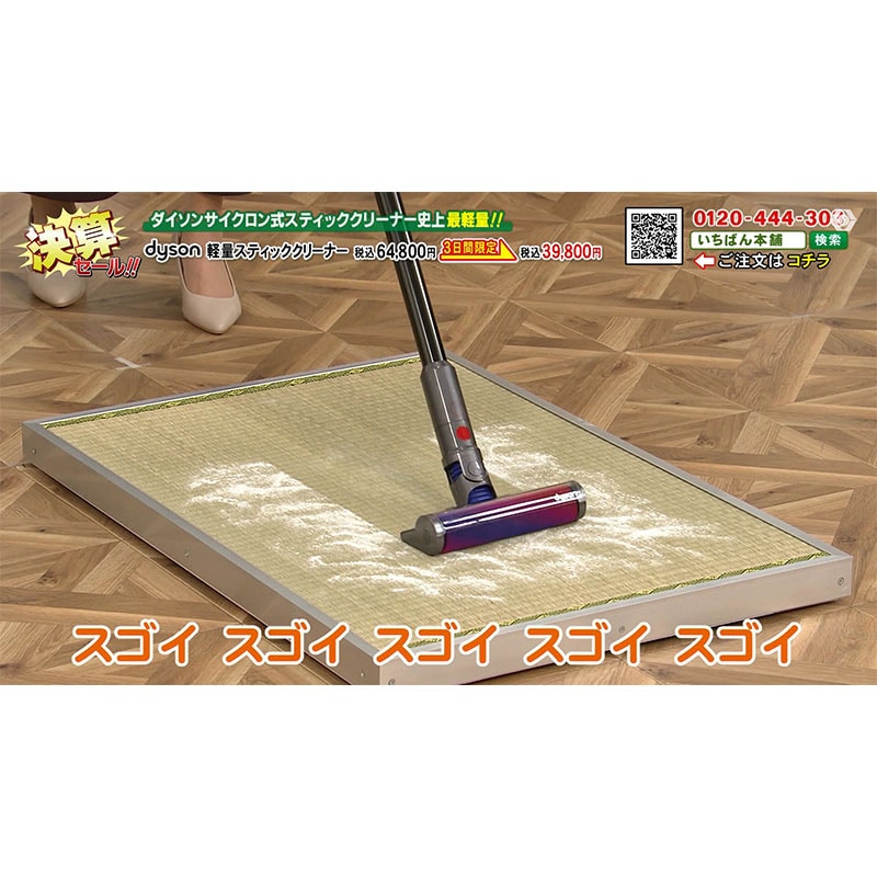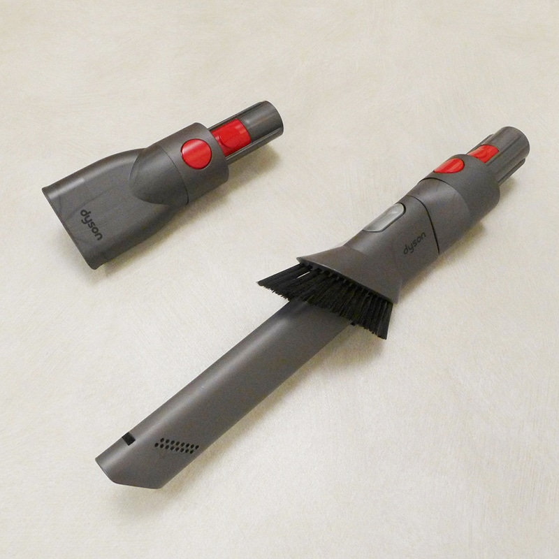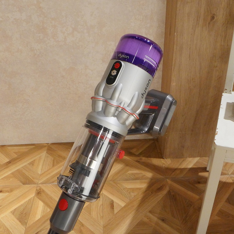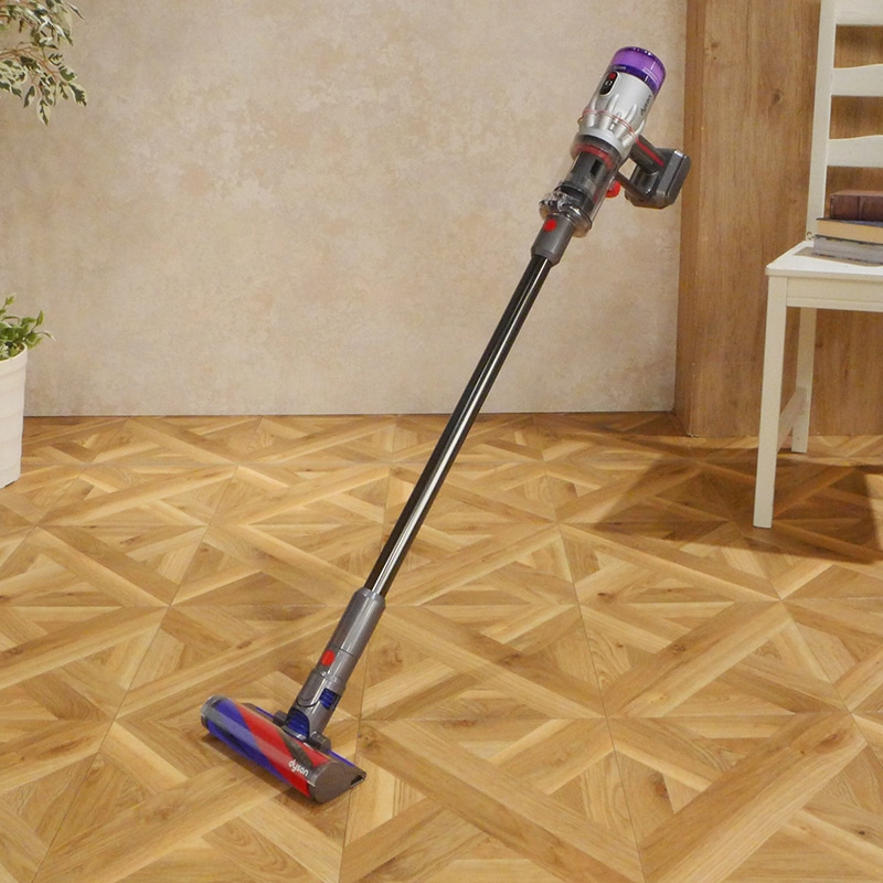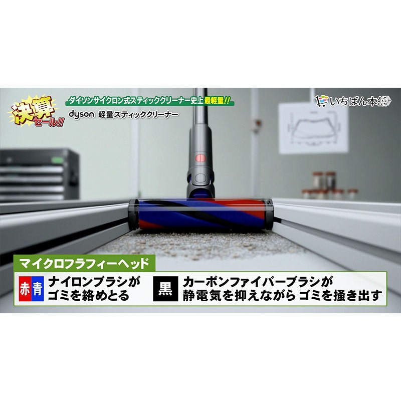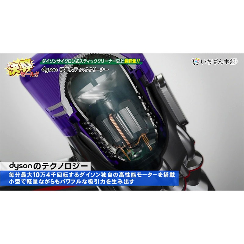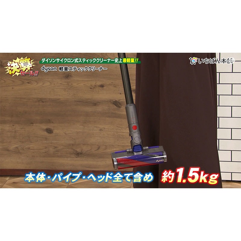 日本の住環境に合わせて、軽さ・使いやすさを徹底的に追及した、「ダイソン軽量スティッククリーナー」です。 メーカー従来品と比べて、重さは約2.5kg⇒約1.5kg、全体で約45%も小型化したので、家具の下や階段など、狭い場所のお掃除はもちろん、コードレスなので、車のお掃除にも便利です。 電源ボタンを一度押すだけでお掃除が可能に。従来品のようにトリガーを握り続ける必要がないので、手が疲れにくく、快適にお掃除を続けられます。 強モード、エコモードの2段階で吸引の強さを切り替えられます。 ダイソン独自の高性能モーターを搭載しているので、小型で軽量ながらもパワフルな吸引力を生み出します。 ヘッドは、コンパクトで小回りのきく「マイクロフラフィーヘッド」を採用、毛絡みしにくく、大きなゴミはもちろん、取りにくい壁際のゴミや、畳の目地に入り込んだゴミまで、しっかりお掃除することができます。 さらに、空気とゴミを分離しながら吸引するので詰まりが起きにくく、ゴミを沢山吸っても吸引力が落ちにくいです。 製品全体で5段階にわたりゴミを捕集する設計で、0.3ミクロンもの微細な粒子を99.99%捕らえて逃しません。※ お部屋の空気よりも綺麗な空気を排出します。 ※ASTM F1977-04に基づくSGS-IBR(米国)による試験結果(2020年に実施)。試験は0.3μm以上の粒子を使用し、強モードで実施。 ゴミ捨てはワンタッチで、手を汚しません。 クリアビンとフィルターは水洗い可能です。 付属のコンビネーション隙間ノズルは、家具の隙間やフローリングの溝など、より細かい場所のお掃除に便利です。 テレビショッピング限定で、テーブルの上のお掃除などに便利な3,300円相当の卓上ツールもお付けします。