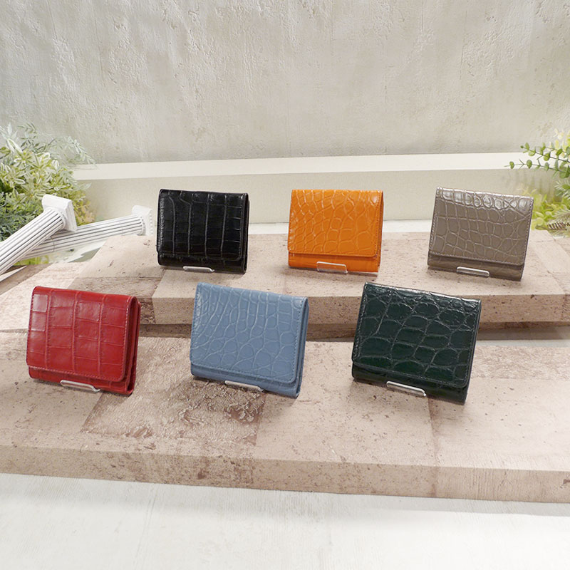 本クロコダイル革を使用した贅沢仕様。 クロコダイルの中でも、美しい腑模様が特徴の“ベリー”と呼ばれる希少部位を使用しています。 なめらかでやわらかい上質な革が、高級感を演出します。 手にしっとり馴染むマット仕上げ。 使うほどに艶が育つ、経年変化をお楽しみいただけます。 手のひらサイズながら、カード6枚、オープンポケット2つ、ボックス型小銭入れ付き。 大きく口開きして中が見やすくなっています。 内側には傷が目立ちにくい牛革を使用したフルレザー仕立て。 ホックでしっかり閉じられスッキリ収納できます。 コンパクトながら収納力に優れ、日常使いも旅行にもぴったり。 様々な診察券を収納して病院用、コインケースとしてお散歩や喫茶店のお供にも。 カラー展開豊富な全6色。鮮やかな発色が美しく、日常を彩ります。 クロコ初心者にもおすすめの上質な財布です。