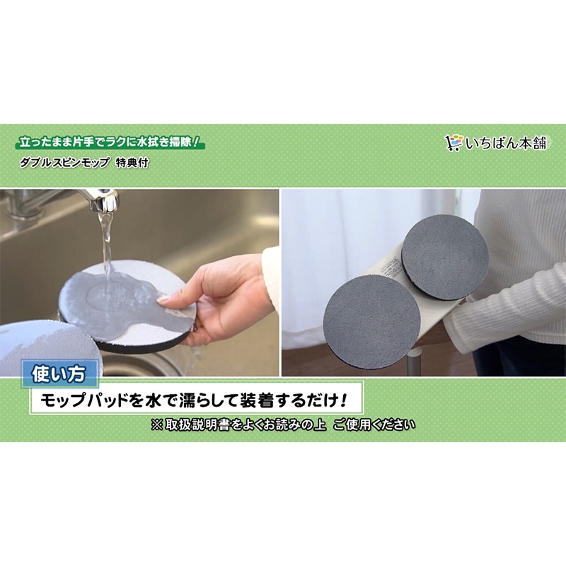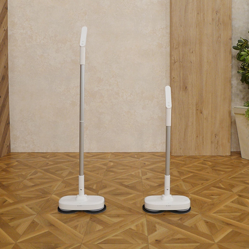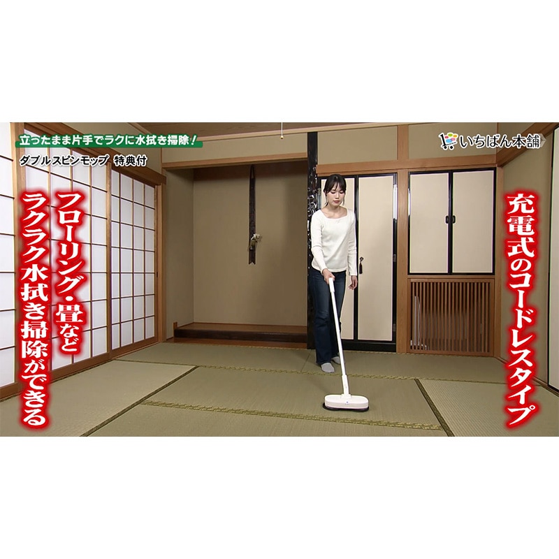 強力ダブルモーターによる、パワフルな回転は、1分間で最大200回転!(強モード) モップパッドの素材には、プロの現場でも使用されている超極細繊維「ベリーマX」を使用。 【高速回転】と【特殊繊維】によるダブル磨きで、汚れや雑菌を、吸い取るように巻き込み、ピカピカに磨いてくれます! フローリングはもちろん、畳、窓、網戸、お風呂の壁などにも使えます。 モップパッドは、着脱式。使用後、水洗いすれば、また使えます。 2段階の長さ調節も可能です。(通常仕様:約105cm/ハンディ仕様:約71cm) 自立するので、収納にも困りません。 充電式のコードレスタイプも嬉しいポイント。