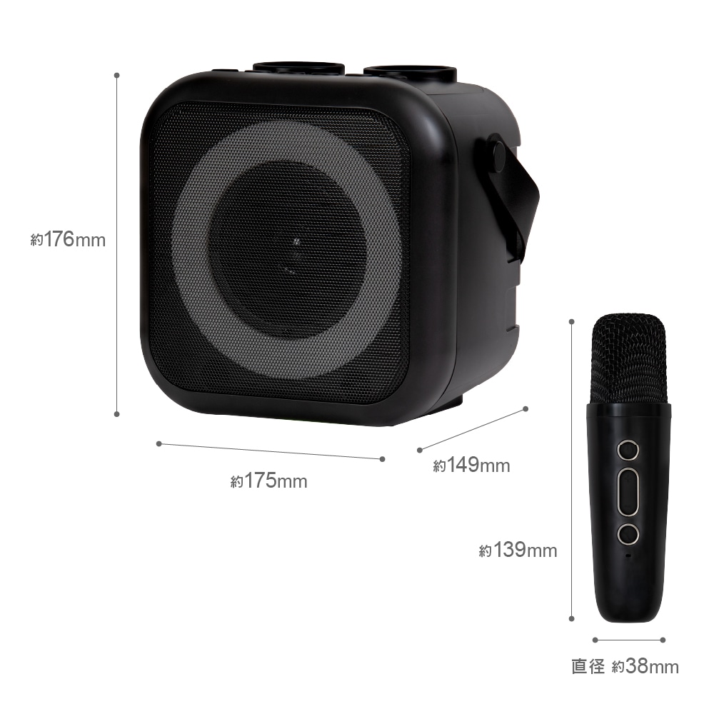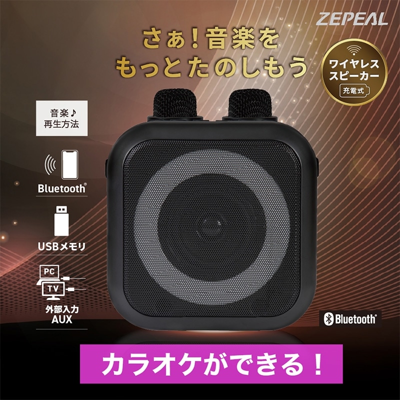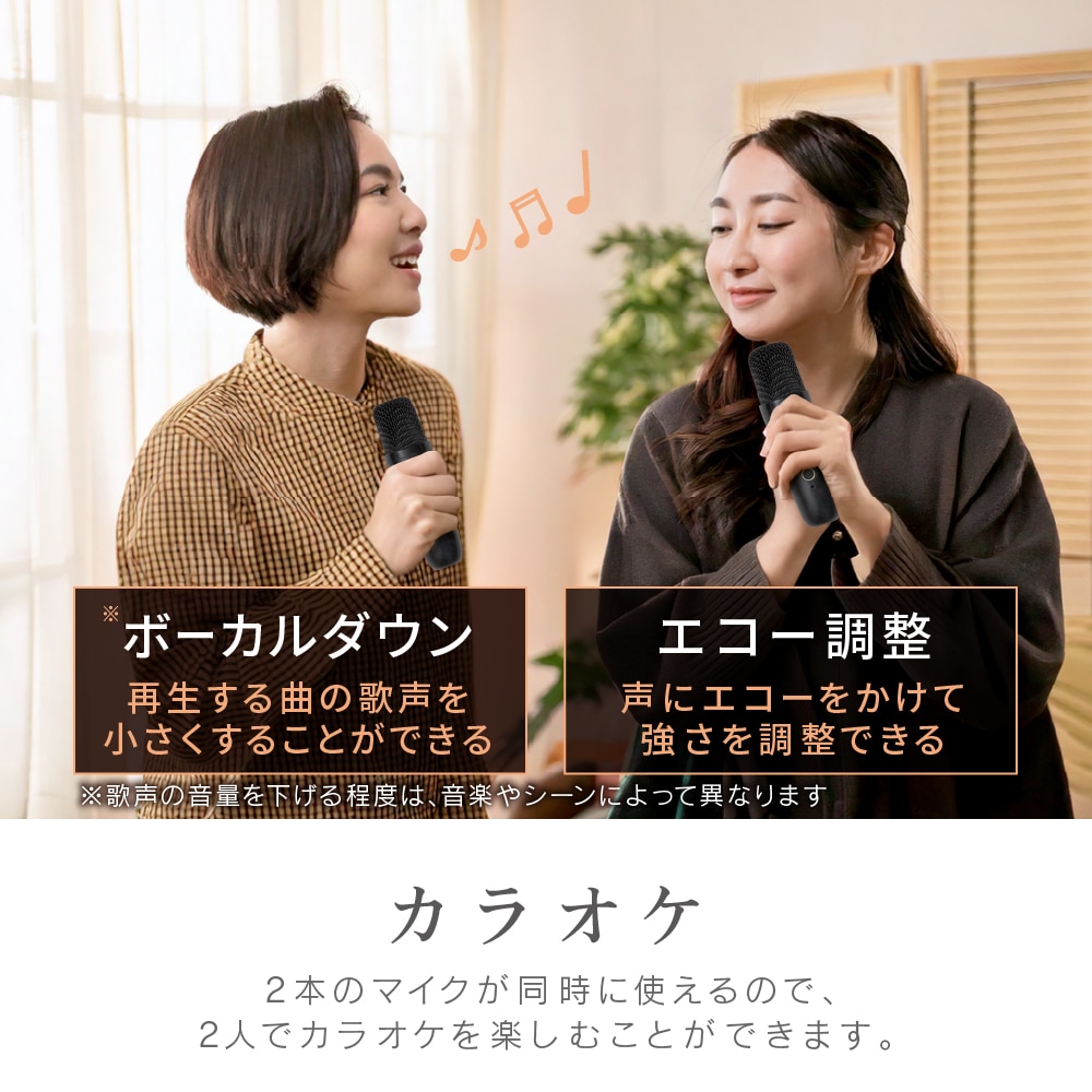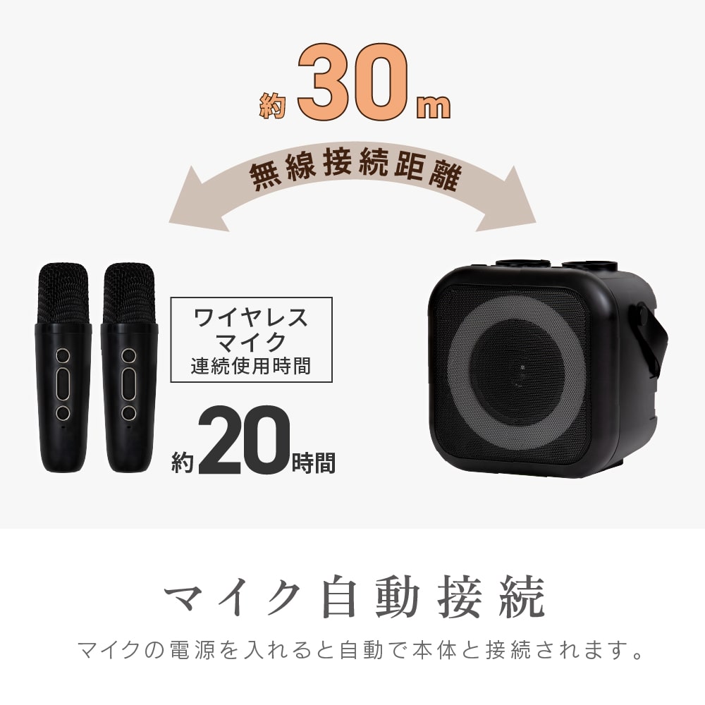 自宅で簡単にカラオケが楽しめる!家庭用カラオケ機器「モバカラ」! お好きな音楽がそのままカラオケに早変わり! マイク2本付きなので、家族や友人と盛り上がれること、間違いなし。 Bluetooth対応の高音質スピーカーだから、カラオケだけでなく、 普段の音楽再生や、イベント時などのマイクとしても使えます。 ・ボーカルダウン機能で、普段聞いている音楽をカラオケ化。 (※ボーカルダウン状況は環境により異なります。) ・接続方法は3種類。「Bluetooth」、「USBメモリ」、「外部入力AUX」。 ・面倒なダウンロードや契約なしで楽しめます。 ・マイクは2本付きでデュエットも可能。 しかも、マイクは本体に収納できます。 ・声まで変えて楽しめる、遊び心満点のボイスチェンジ機能あり。 (4種類:女性の声、男性の声、モンスターの声、子どもの声) ・音楽ジャンル切り替えも4種類。(ジャズ、ポップ、ロック、クラシック) ・日本語音声ガイダンスがついているので、操作も簡単。 ・充電式なので手軽に持ち運びも可能です。 ・町内会やイベントなどで、スピーカーと無線マイクとしても、幅広く活躍できるのも嬉しいポイント。 多機能で、手軽に「カラオケ」が楽しめる優れもの! 親族の集まりや、友達と家で遊ぶ時など、一家に一台、いかがでしょうか?