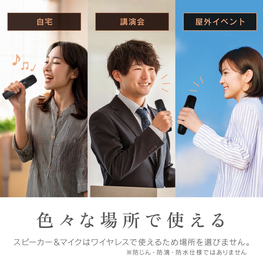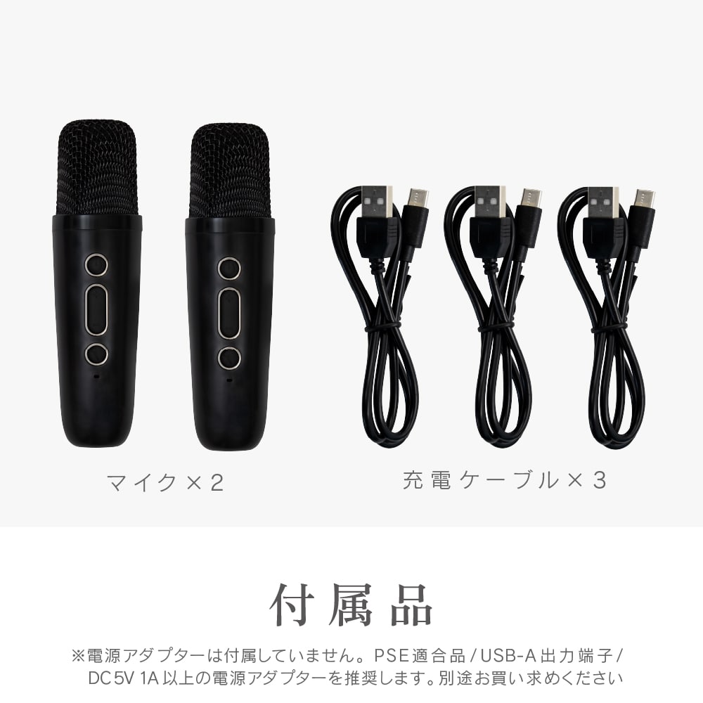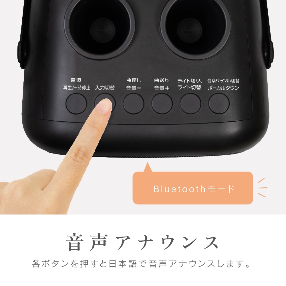 自宅で簡単にカラオケが楽しめる!家庭用カラオケ機器「モバカラ」! お好きな音楽がそのままカラオケに早変わり! マイク2本付きなので、家族や友人と盛り上がれること、間違いなし。 Bluetooth対応の高音質スピーカーだから、カラオケだけでなく、 普段の音楽再生や、イベント時などのマイクとしても使えます。 ・ボーカルダウン機能で、普段聞いている音楽をカラオケ化。 (※ボーカルダウン状況は環境により異なります。) ・接続方法は3種類。「Bluetooth」、「USBメモリ」、「外部入力AUX」。 ・面倒なダウンロードや契約なしで楽しめます。 ・マイクは2本付きでデュエットも可能。 しかも、マイクは本体に収納できます。 ・声まで変えて楽しめる、遊び心満点のボイスチェンジ機能あり。 (4種類:女性の声、男性の声、モンスターの声、子どもの声) ・音楽ジャンル切り替えも4種類。(ジャズ、ポップ、ロック、クラシック) ・日本語音声ガイダンスがついているので、操作も簡単。 ・充電式なので手軽に持ち運びも可能です。 ・町内会やイベントなどで、スピーカーと無線マイクとしても、幅広く活躍できるのも嬉しいポイント。 多機能で、手軽に「カラオケ」が楽しめる優れもの! 親族の集まりや、友達と家で遊ぶ時など、一家に一台、いかがでしょうか?
