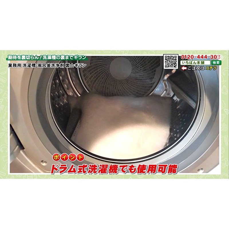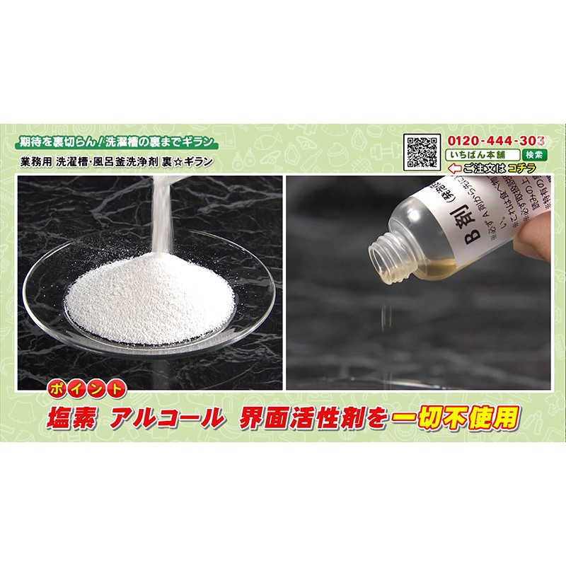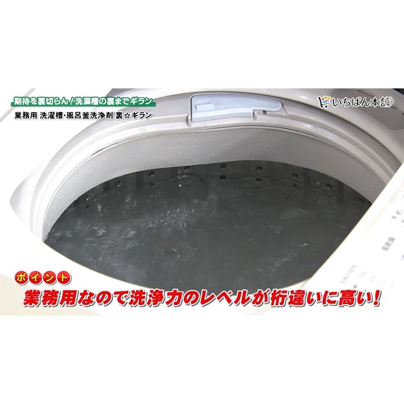 ・洗濯槽の裏側についた汚れまで短時間できれいに落とすことができる業務用洗浄剤です。長時間の漬け置き洗いは不要で、洗浄時間はわずか20分。クリーニング店やスーパー銭湯など長時間の作業が困難なところで活躍してるプロ仕様の洗浄剤です。A剤の「高濃度酸素」がカビやバクテリアにアタックして汚れを出してくれます。その後、発泡促進剤の「B剤」が一気発泡することによって届きにくかった奥の汚れをしっかりかき出してくれます。・活性酸素の働きで除菌&消臭効果塩素、界面活性剤、石鹸、香料、アルコールといった成分を使用せず「高濃度酸素」と「水」の力で汚れをしっかり落としてくれます。縦型はもちろん、ドラム式でも使用できます。さらに洗濯槽だけではなく家庭用の風呂釜でも使用可能。使用頻度の目安は4ヶ月に1度。年3回の洗浄で除菌、除カビ、消臭効果を持続します。・使用後のお手入れ方法洗濯槽洗浄の場合:カビ等の汚れが槽内に付いている場合は、ティッシュ等で拭取り再度すすぎを行なってください。風呂釜洗浄の場合:洗浄が完了した後、浴槽、風呂備品をヌメリがなくなるまでシャワー等で流しよく洗います。※ご使用前に付属の取扱説明書をよくお読みの上、正しくご使用ください。※完全に汚れを落としきれない場合がございます。※環境や使用状況によって異なります。※一部使用できない機種等ございます(二層式洗濯機/運転途中の扉の開閉ができない洗濯機/海外製の洗濯機など)。※2つ穴の風呂釜には使用できません。