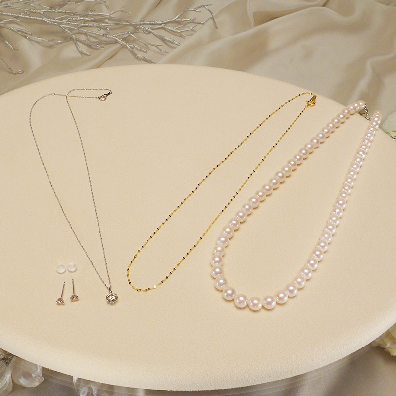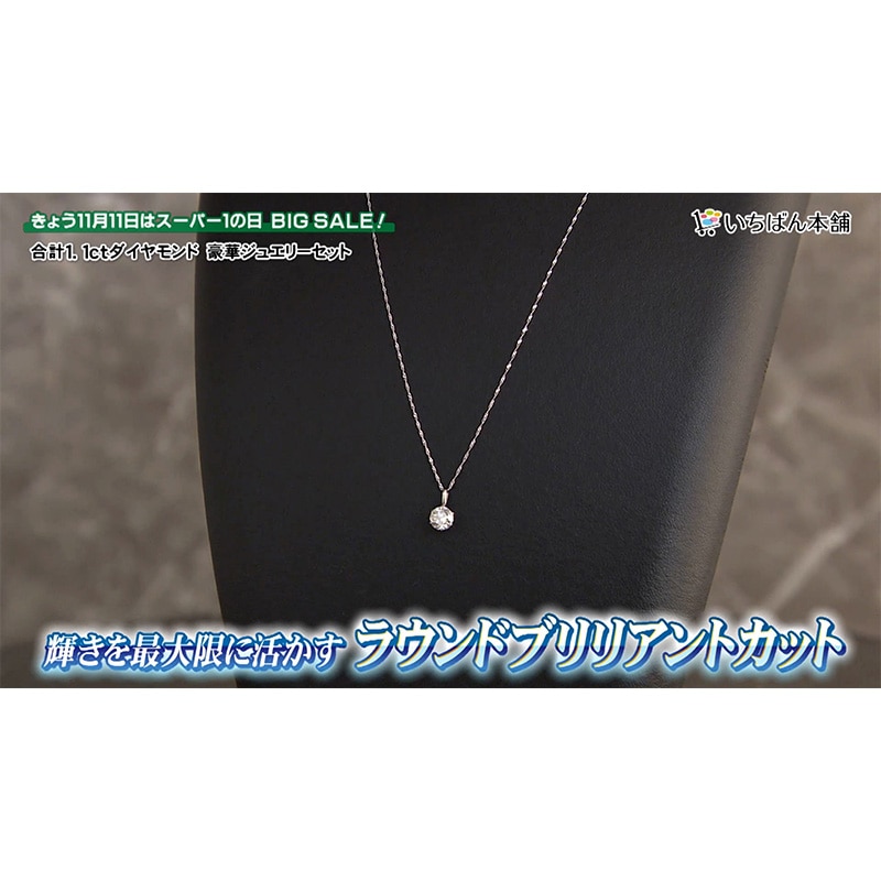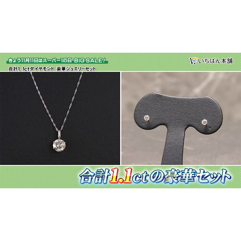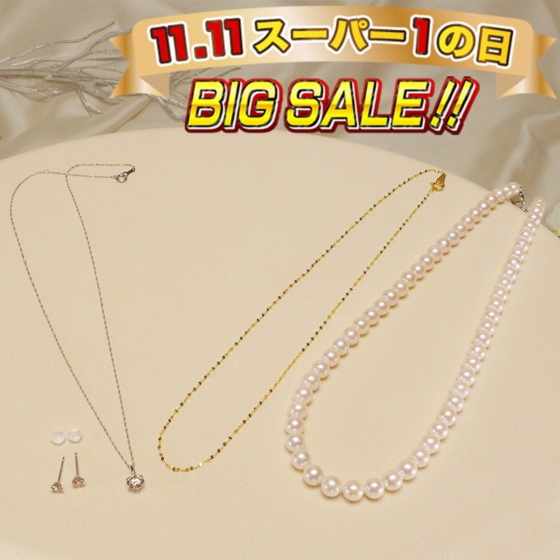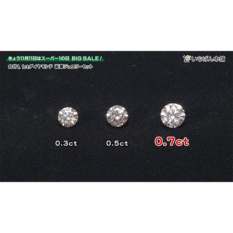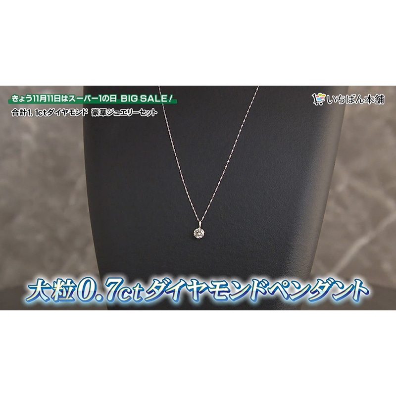 いちばん本舗 スーパー1の日ということで、0.7ctダイヤモンドペンダント・合計0.4ctダイヤモンドイヤリング又はピアスの合計1.1ctのダイヤモンドジュエリーのご紹介。 ダイヤモンドは、0.5ctから大粒と言われていますが、今回はそれを上回る0.7ctのダイヤモンドを使用し、人気の高いシャンパンカラーでご用意いたしました。 ペンダントトップには、プラチナ900、チェーンにはプラチナ850を使用した人気のスクリューチェーンを使用しています。 ラウンドブリリアントカットで仕上げたダイヤモンドとプラチナが、動くたびにキラキラと輝きを放ちます。 さらに今回は、両耳合わせて合計0.4ctのイヤリングまたはピアスもセットにしました。 フォーマルだけではなくカジュアルな装いなど幅広く様々なシーンで活躍します。 純金ならではの深い黄金色と輝きを楽しめる、華やかな印象のペタルチェーンネックレスもセットにしてお届けいたします。 「ペタル」とは、フランス語で花びらを意味し、チェーン部分のひとつひとつをプレスした面が光を集め、動くたびに光を反射。ゴールドが一層美しく煌めきます。 さらに今回は、BIG SALE!ということで、6-6.5mmサイズのアコヤ本真珠を使用したネックレスもお付けいたします。 6mm珠は普段使いもしやすいサイズで、フォーマルはもちろん、普段の装いに合わるのもおすすめ。華やかさや上品さを演出します。 1つ持っていると便利なジュエリーです。
