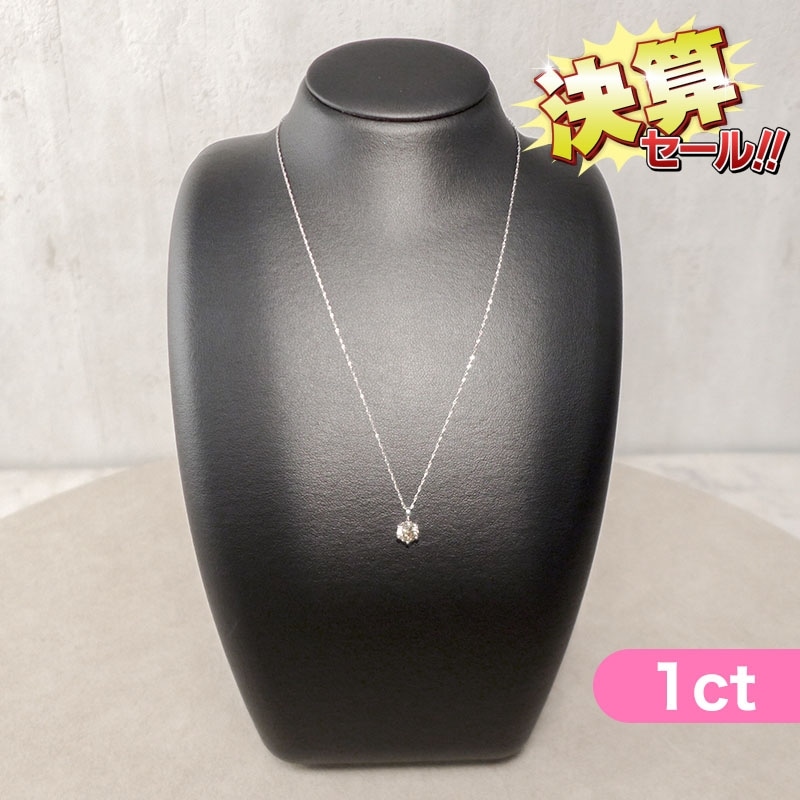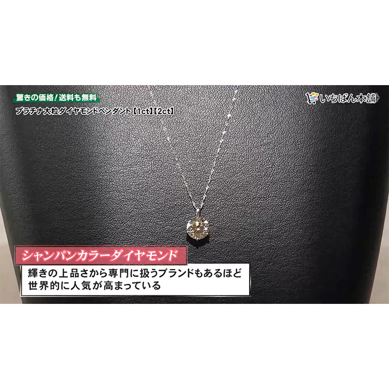 憧れのサイズ「大粒1ct」のダイヤモンドペンダントのご紹介。 一般的に婚約指輪などに使用される人気の大きさが0.3ct、0.5ct以上から大粒と言われています。今回は上回る大粒1ct! 上質な「シャンパンカラー」の天然ダイヤモンド。 肌なじみのよい落ち着いた色味と、透き通るような透明感が特徴で、1ctというボリュームがありながらも上品な印象に仕上がっています。 様々な品質・シャンパンカラーの中から輝きの美しいダイヤモンドのみ厳選します。 ダイヤモンドの輝きにもこだわり、ダイヤモンドが最も美しく輝くといわれるラウンドブリリアントカットを採用。 この貴重な一粒を引き立てるため、トップ部分には純プラチナ、チェーンにはプラチナ850を使用。 スクリューデザインのチェーンが動くたびに輝きを放ち、首元を華やかに彩ります。 いちばん本舗のお客様のために今回コツコツ集めたものをお買い得な価格でご紹介いたします。 さらに今回は、角度によって虹色に輝く1ctのオパールペンダントも特典でお付けいたします。