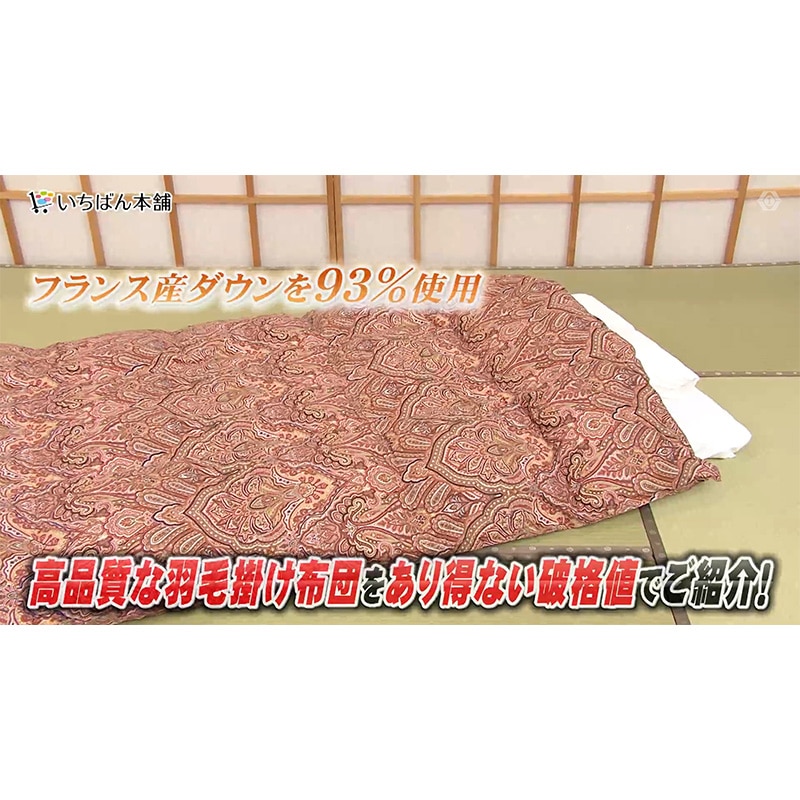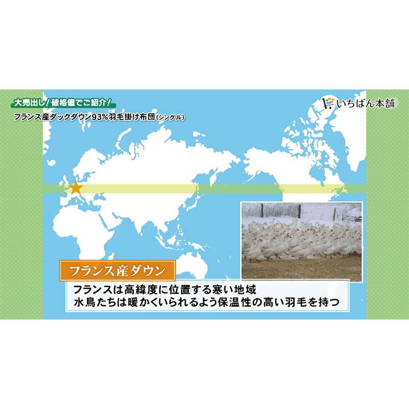 在庫限り!見逃さないでほしい! 数量限定で高品質なnishikawaの羽毛掛け布団をいちばん本舗だけの破格値でご紹介! ダウンの世界有数の産地として知られるフランス産のふわふわの暖かい羽毛を使用。 さらにその中でも贅沢なバーバリー種に厳選しました。バーバリー種は、一般的なダックより身体が大きな品種です。 身体が大きいということは、ダウンボールももちろん大きい!ダウン1つ1つが空気をたくさん含みふわっふわで温かい! また、そんなダウンが一般的に50%以上入っていれば羽毛布団と呼ぶことができるところ、今回の商品はダウンの割合がなんと93%で西川でもトップクラス!しかも、ダウン一粒一粒が大きく、あたたかさを表すダウンパワーは驚異の400cm3/g。 さらに側生地は綿100%。汗をかいた後の湿気を吸ってくれて、不快なムレ感を軽減。 いつでも爽やかで快適なあたたかさを実現してくれます。 縫製にもこだわり、衿・お腹・足元フィットする立体キルトで、暖かく快適に。 また側生地はダニ通過率0という試験結果が出ているので安心してご使用いただけます。 現在羽毛の原料は過去5年間でおよそ180%へ高騰中。そんな中での、いちばん本舗での破格値企画!今後、羽毛の買い替え検討をされている方にもお勧めです。