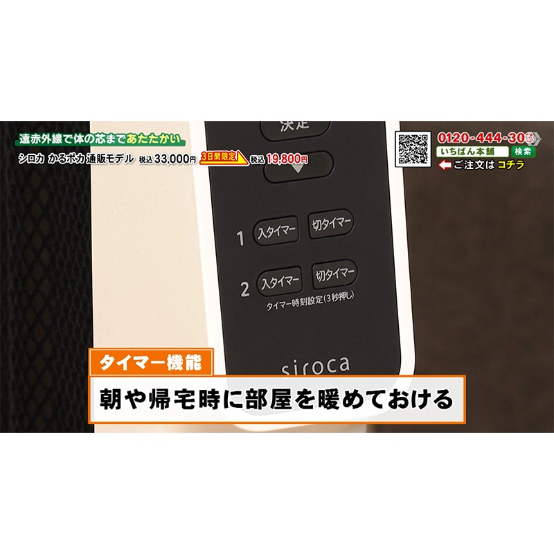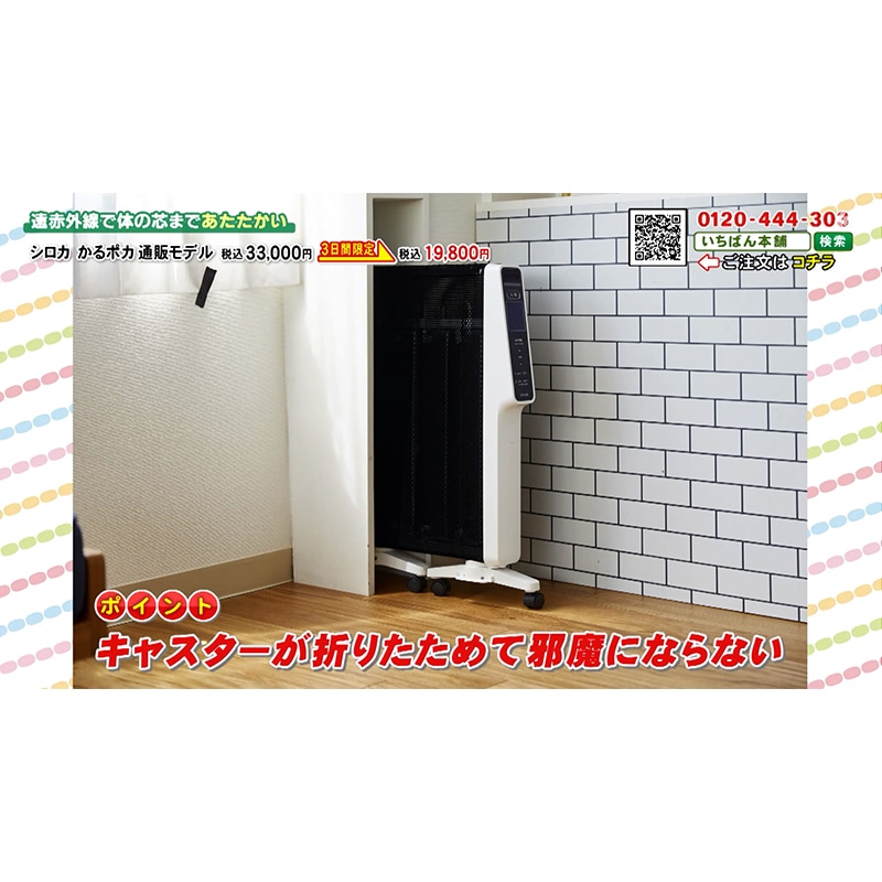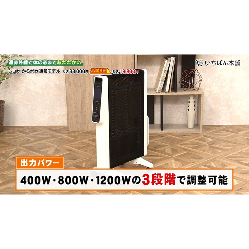 大人気の遠赤ヒーターかるポカが通販モデルで登場! ・温度モード、節電モード、パワーモードの3つのモードを搭載しております。 ・温度モードは14~28℃の間で温度設定可能で、設定温度と周囲温度の差により、パワー(暖房の強さ)を自動で切り替えながら運転します。 ・節電モード設定の場合、パワー控えめで運転するため消費電力を抑えられます! ・パワーモードは400W、800W、1200Wの三段階からお好みに合わせて設定可能、連続運転します。 ・遠赤外線の放射量が多い天然鉱石「雲母」を使用しているので、しっかり身体とお部屋をあたためることができます! ・遠赤外線は、一度温まると冷めにくいのも特長!ヒーターを停止してもすぐに体が冷えず、温かさが長続きします。 ・足元にもヒーターパネルを配置しているので、冷えやすい足元もしっかり温めます。 ・起きる時間や就寝時間に合わせてオン、オフ両方のタイマーも設定できて便利です! ・8時間連続使用した場合、自動で電源オフになります。 ・使用していても音が気にならない静音設計です。 ・かるポカは風が出ないのでフィルター掃除も不要、ホコリやハウスダストも巻き上げず、お部屋の空気を汚しません。また、肌や喉に風が当たり続けることによる乾燥も防ぎます。 ・本体重量は約4.8kgの軽量設計。さらにキャスター付きで、使いたいときに使いたい場所へ、簡単に移動させることができます。 ・脚が畳めるので、収納場所にも困りません。