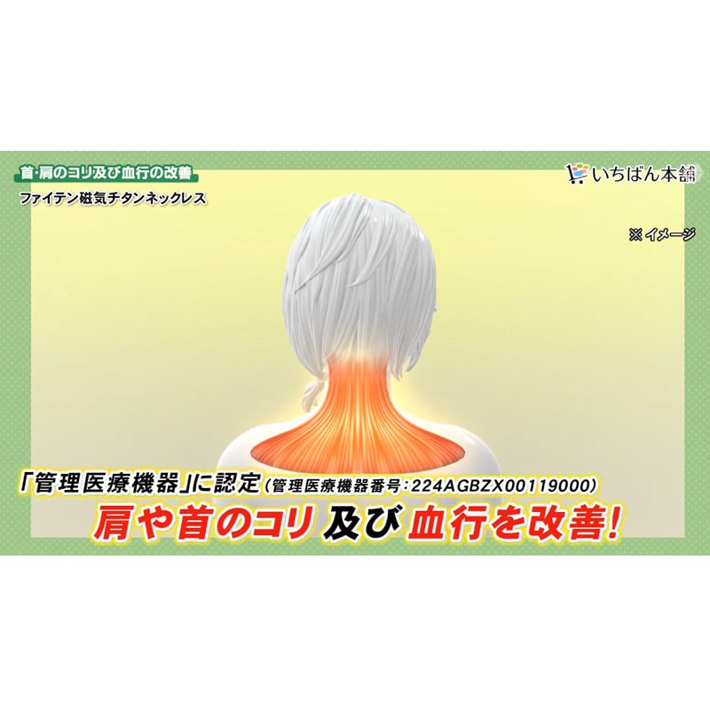 数々の有名アスリートから愛されるファイテンから、管理医療機器を取得した永久磁石の特別な磁気チタンネックレスが登場。 一般的な磁気ネックレスは、磁石のある部分のみでしか磁力が働きませんが、本商品は紐生地の中芯全体に磁石を採用している新しい構造。 紐部全体から50mT(ミリテスラ)の磁気が放出されるので、装着部位となる肩や首のコリ及び血行の改善に効果を発揮します。 さらに、身体をリラックス状態へサポートする、ファイテン独自素材「アクアチタン」を50倍の濃度で配合しています。 服装を選ばないスタイリッシュなデザインに仕上げています。 たった約18.5gの軽さで、首回りも50cmとゆったりとした着け心地です。 フロント着脱式なので取り外しも簡単です。