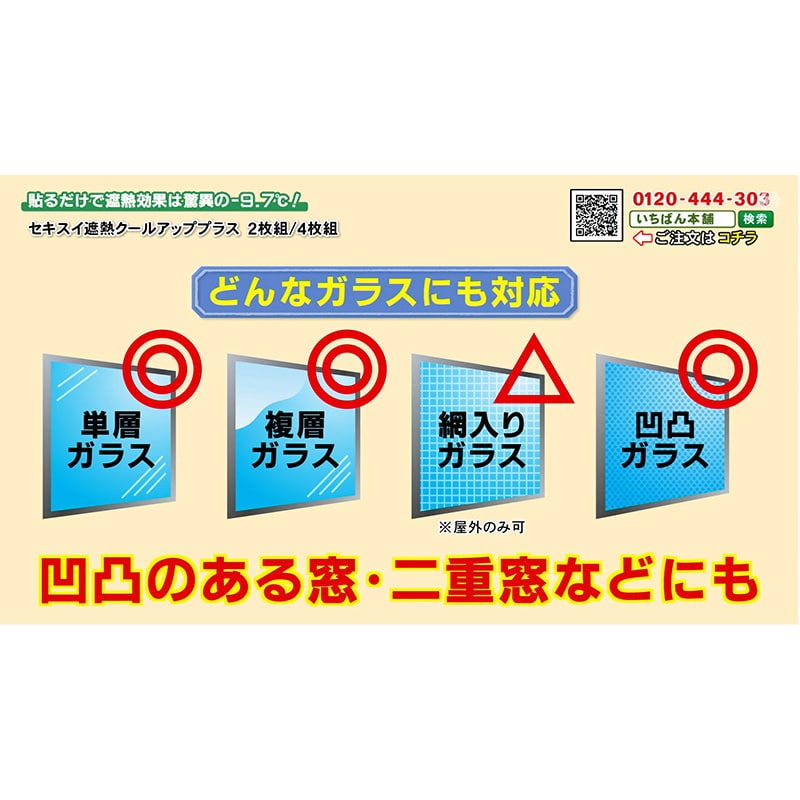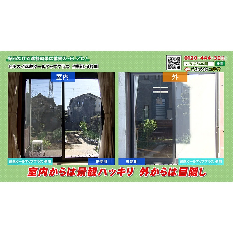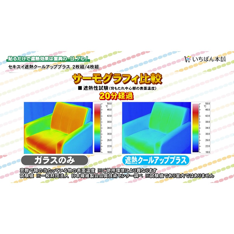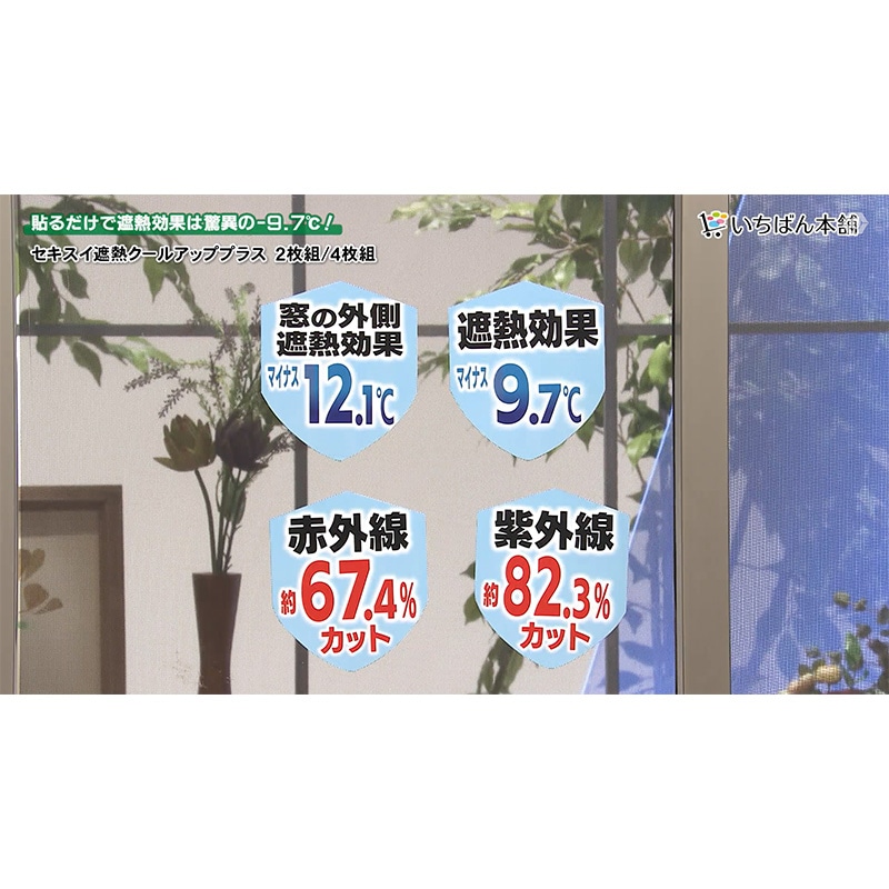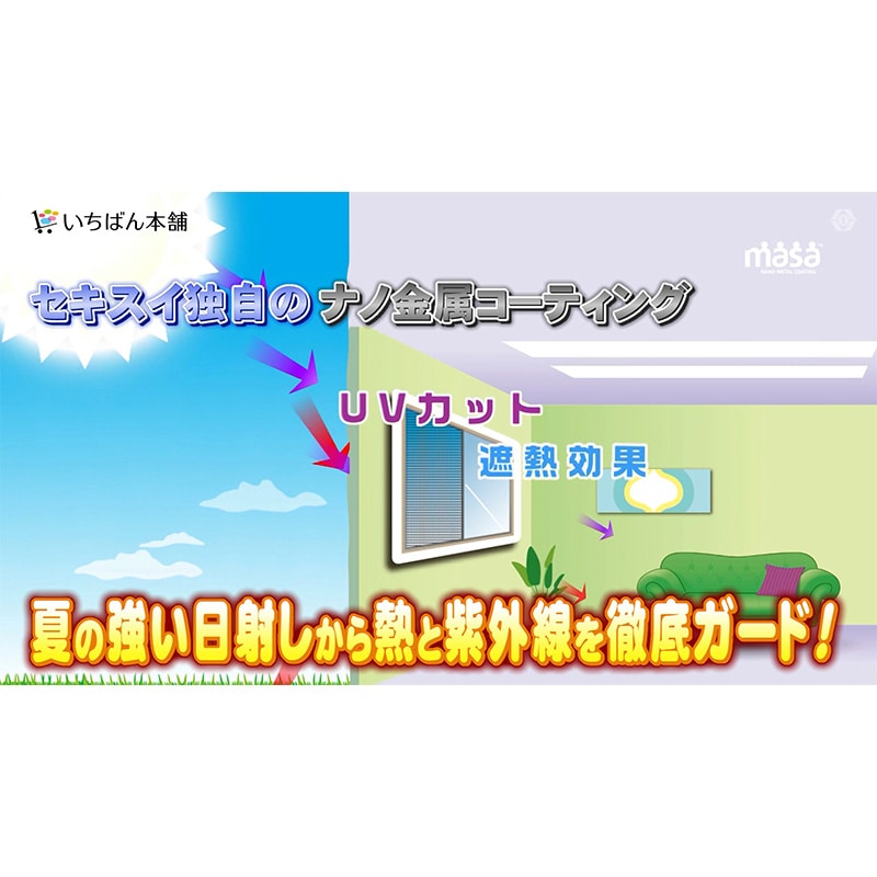 窓に貼るだけで夏の強烈な日射しと熱を徹底ガード! その秘密は「ナノ金属コーティング 通称masa」セキスイ独自の技術でシート表面を金属コーティング。 コーティングが施された銀色の面が太陽の光と熱を反射し、夏の強い日射しから室内を守ってくれます。 窓際の温度変化を想定した試験(※)では、室内から設置した場合-9.7℃!さらに外から設置した場合は、-12.1℃! このようにしっかりとした実験結果もあります。 ※試験装置(0.131立法メートル)を用いた赤外ランプ60℃法による断熱性試験(8cm離れた対象の温度変化の測定)※試験値であり、室温ではありません 熱を遮って部屋の温度を快適にするだけではなく、紫外線は82.3%カット・赤外線は67.4%カット! ※試験環境下での結果です 特殊コーティングが太陽光を反射することで、日中は外から室内が見えにくい「目隠し効果」を発揮。 外からは室内が見えにくいため、プライバシーの保護につながります。 中からは景観がハッキリと見え、部屋の中が暗くなることもないので安心です。 メッシュ素材なので風通しは抜群。 網戸のサッシ枠に取り付ければ、風を通しながら日射し対策が可能。 日差しが気になる窓ガラスに、付属の面ファスナーで貼るだけでOK! 位置を確認しながら何度でも貼り直すことができ、ネット状なので気泡やシワの後悔もなくスッキリ取り付けが可能です。 付属の定規でガイドしながら、ハサミかカッターで窓の大きさに合わせて簡単にカットできます。 コーティング加工により汚れが付きにくく、汚れが気になる際には洗濯機で丸洗いOKの簡単お手入れ。※洗濯ネット使用 使わない時期はコンパクトに収納ができ、次のシーズンも繰り返し何度でも使えます。