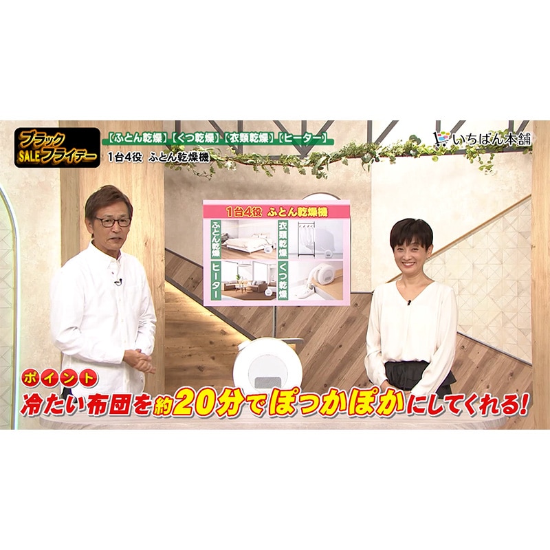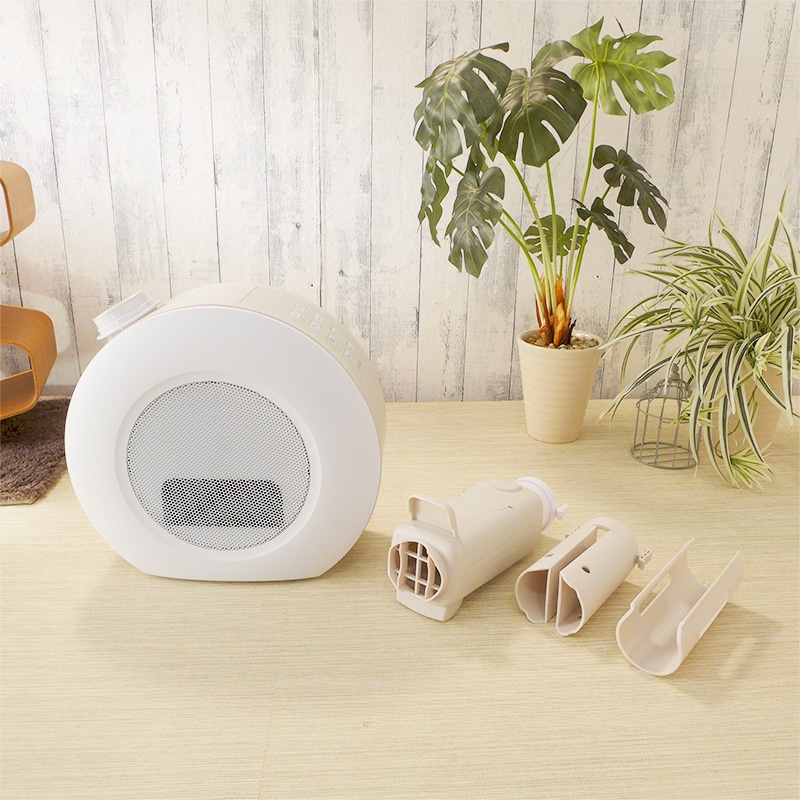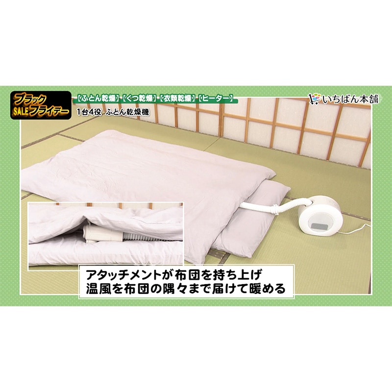 1台4役のオールシーズン活躍する ふとん乾燥機のご紹介! 専用ノズルからパワフルな温風を送り込み、冷たいふとんも最短20分(※速暖モードの場合)で ふっくらあたたため、寝入りをスムーズにサポートします。 ダニアタックモードも搭載。ダニの繁殖を抑え、清潔で快適な睡眠環境へ導きます。 ふとん乾燥は「冬モード」「夏モード」があり、「冬モード」は60分の温風運転でふとんを温め、 「夏モード」は60分の温風運転後、20分の送風運転で熱気を取り除きます。 冬場の冷え込みや梅雨、夏場の湿気にも活躍します。 「衣類乾燥」「くつ乾燥」も可能!付属のアタッチメントを取り付けボタンを押すだけ。 部屋干しの衣類にしっかり温風を当てて乾かし、イヤなニオイや湿気を防ぎます。 雨の日や花粉の季節で外に干せない時も安心です。 濡れてしまったスニーカーやブーツもすぐに乾かせ、お子様の通学靴や運動靴、 仕事用の革靴や長靴まで、シーズンを問わずスッキリ乾燥できるのでとても便利です。 さらに「ヒーター」機能も搭載。 お部屋や足元を素早くあたためる、ちょっと肌寒い時や冬場の冷え対策にぴったりです。 軽量で持ち運びやすく、リビングや寝室、脱衣所やトイレなど必要な場所にさっと移動してすぐ使えます。