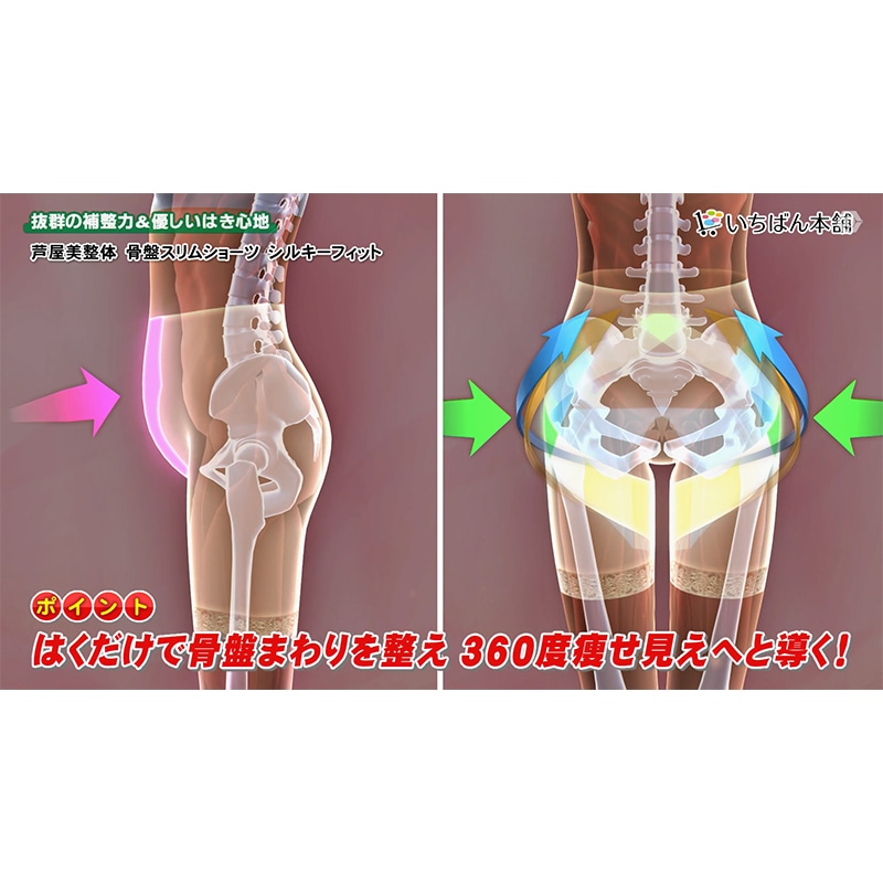 4万人以上の骨盤をみてきた骨盤矯正サロン「芦屋美整体」の納富亜矢子先生が監修。 はくだけで骨盤まわりを整え、360度どこから見てもスッキリとした「痩せ見えボディ」へと導くのが、この『骨盤スリムショーツ シルキーフィット』です。 ぽっこりお腹や垂れ尻など、年齢とともに気になる体型の悩み。土台となる骨盤まわりのケアが欠かせません。骨盤は、脚を組んだりカバンを片側だけで持ったりといった、日々の何気ない動作で簡単にバランスを崩してしまうものです。 骨盤の前傾・後傾・左右の広がりといった多方向の歪みに対応。独自構造のパネルとクロスベルトが骨盤を正しい位置でサポートし、無理なく自然な美しい姿勢をキープします。 さらに、機能性だけでなく「はき心地」にもこだわりました。メイン生地には薄く伸縮性の高い素材を、補整部分にはパワーメッシュを採用。シルクプロテイン加工を施すことで、しっとりとなめらかで、優しいはき心地を実現しました。 お腹の内側には肌に優しい綿混素材、クロッチ部分は綿100%を使用しているため、これ1枚での着用も可能です。通気性が良く熱がこもりにくい設計に加え、吸水速乾性にも優れているため、汗をかく季節でも一日中快適にお過ごしいただけます。