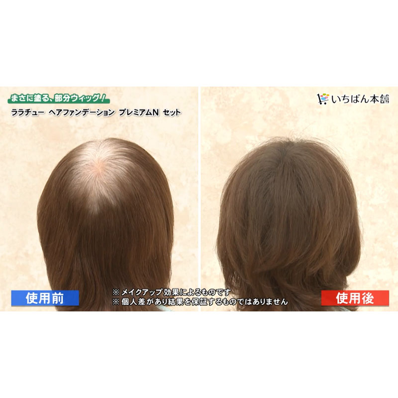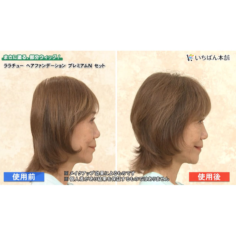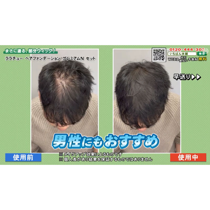 生え際やつむじの白髪、地肌の目立ち、ボリュームがないなど、気になる髪のお悩みにオススメ! シリーズ累計販売数398万個突破の美容大国 韓国初!「ララチューヘアファンデーション プレミアムN」をご紹介! ポンポンするだけで、白髪・薄毛カバー&ボリュームアップができる、まさに塗る部分ウィッグのような商品です。 髪はもちろん、頭皮に塗ってもOKなので、簡単に塗ることができます。 スプレーやミストで固めないので、塗った後もブラシ通りが良いのも特徴の一つ。 パウダーの粒子が板状&パウダーを美容オイルでコーティングしているので、長時間しっかりと密着し、粉飛びもしにくいです。 ララチューは汗や水に強いウォータープルーフ仕様です。 落とす際は普段お使いのシャンプーで簡単に落とせます。 皮脂を吸着してベタツキを防止し、サラサラな仕上がりにします。 髪と頭皮どちらにも嬉しい美容成分が37種類も配合されています。 ダークブラウン1色で、どなたでも自然に仕上がります。 本品一つで、約3.5ヶ月使用でき経済的です。 専用パフは先が尖っているので生え際に塗りやすく、さらに手を汚さないミトンタイプです。 毎日お使いいただきたいので、お得なレフィルとパフ2個をセットでお付けいたします!