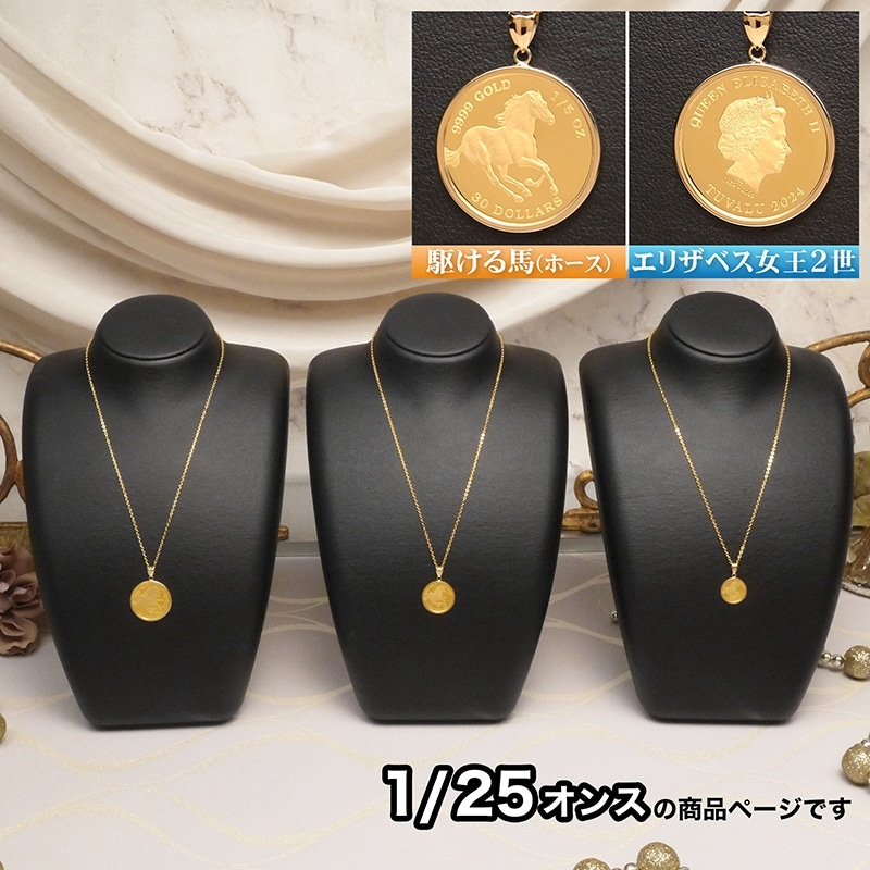 金の相場が高騰する中、純金コインペンダントのご紹介。 デザインには「駆ける馬」と「エリザベス女王2世」。 エリザベス女王は、多くの競走馬を所有する愛好家で、「駆ける馬」は前進・飛躍の意味を持つ幸運のモチーフとしても人気があります。 2022年にエリザベス女王が崩御され、デザインが変わりつつあり、エリザベス女王デザインのコインは少なくなってくることも考えられます。 今回のコインは、南太平洋に浮かぶイギリス連邦加盟国ツバル政府発行。 オーストラリアでも古く120年以上の歴史を持つパース造幣局製造です。 純金・純度99.99%の証である「9999GOLDマーク」も刻まれています。 インゴットと同じ濃い山吹色で、この輝きと色の深みは純金でしか出ない色です。 コイン枠は18金、届いてすぐに使用できるようサービスチェーンお付けいたします。 大丸松坂屋ネーム入りケース・保証書付でお届けいたします。