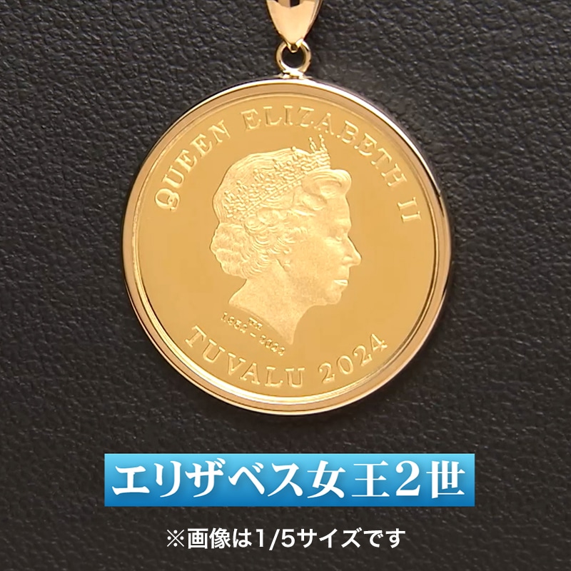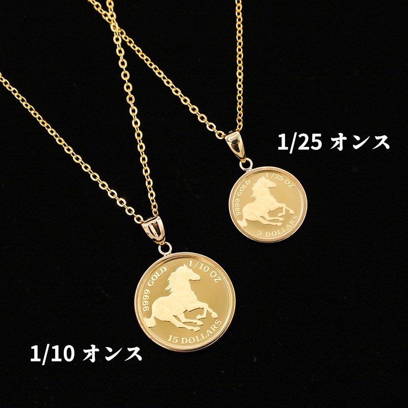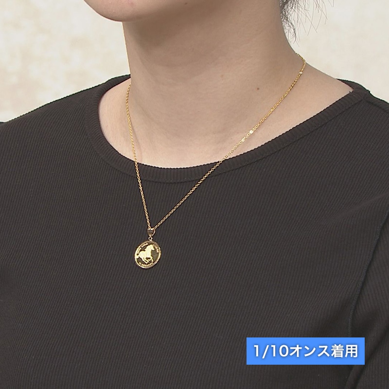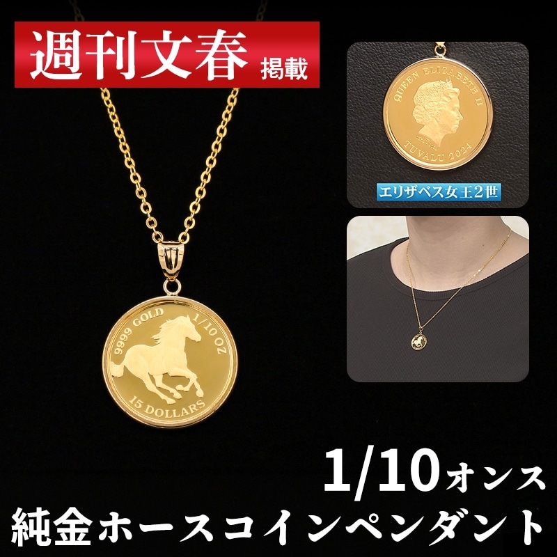 金の相場が高騰する中、純金コインペンダントのご紹介。 デザインには「駆ける馬」と「エリザベス女王2世」。 エリザベス女王は、多くの競走馬を所有する愛好家で、「駆ける馬」は前進・飛躍の意味を持つ幸運のモチーフとしても人気があります。 2022年にエリザベス女王が崩御され、デザインが変わりつつあり、エリザベス女王デザインのコインは少なくなってくることも考えられます。 今回のコインは、南太平洋に浮かぶイギリス連邦加盟国ツバル政府発行。 オーストラリアでも古く120年以上の歴史を持つパース造幣局製造です。 純金・純度99.99%の証である「9999GOLDマーク」も刻まれています。 インゴットと同じ濃い山吹色で、この輝きと色の深みは純金でしか出ない色です。 コイン枠は18金、届いてすぐに使用できるようサービスチェーンお付けいたします。 大丸松坂屋ネーム入りケース・保証書付でお届けいたします。