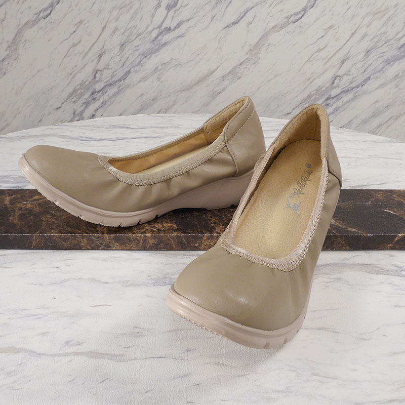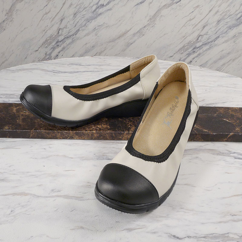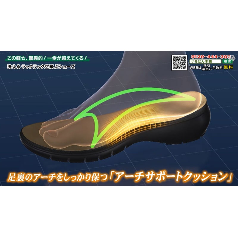 片足わずか約99g、卵2個分ほどで風船で浮くほどの軽さにシューズ! 足に負担を感じにくく、まるで裸足で歩いているような心地よさでどこまでも歩きやすく、普段のお出かけや旅行先での長距離移動も安心。 さらに汚れが気になったらまるっと水洗いができるから、いつでも清潔に。 アッパー生地はやわらかなスーパーストレッチ生地で足指の動きにぴったりフィットして、快適な履き心地を実現します。 アウトソールは足裏に沿うようにしなやかに曲がるので、自然で軽やかな歩行をサポート。 しかも4E相当のオリジナル木型を採用し、幅広さんのお悩みにも寄り添います。 風船が浮くほどの軽さと柔らかさで、 インソールにはアーチを支える立体クッションを、またかかとにはパカパカしづらいサポートパッド付き。 長時間歩いてもラクに、元気に前へ進めます。 どんなファッションにも合わせやすい機能的で上品なデザイン。 思わず外に出かけたくなるような一足、それがラックラックのパンプスです!