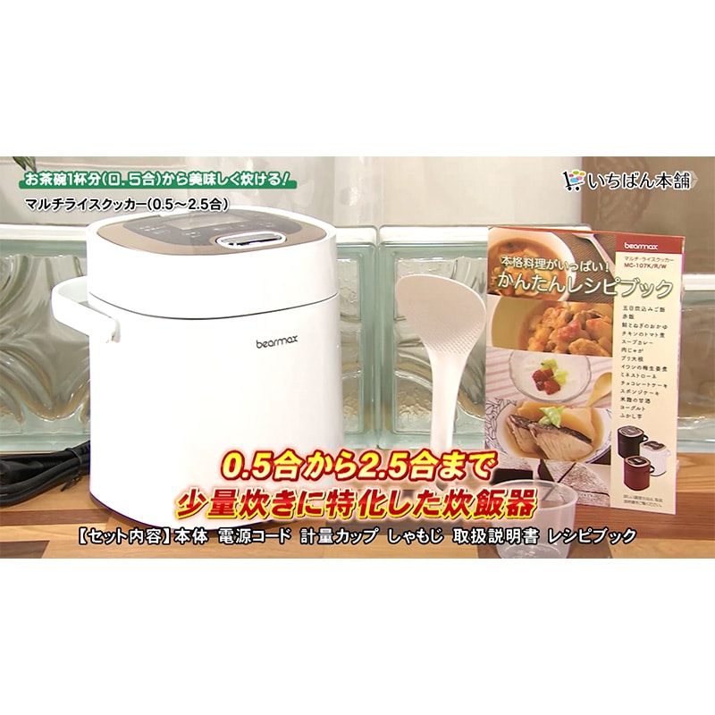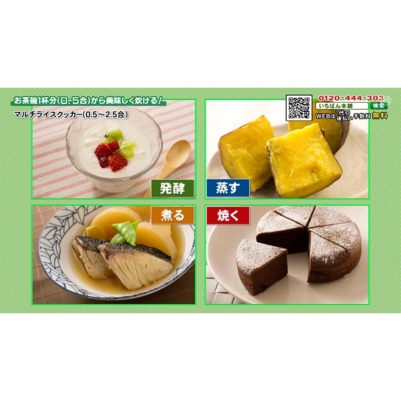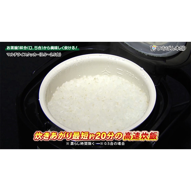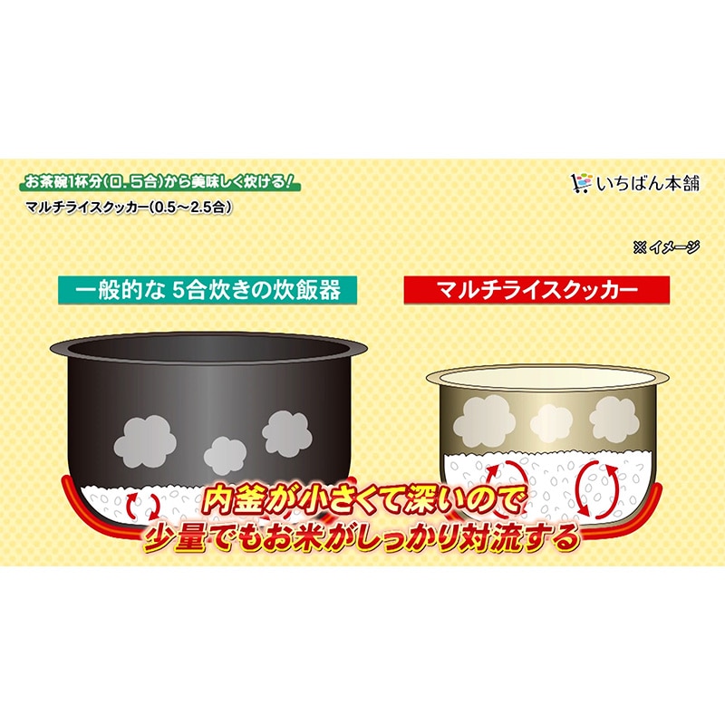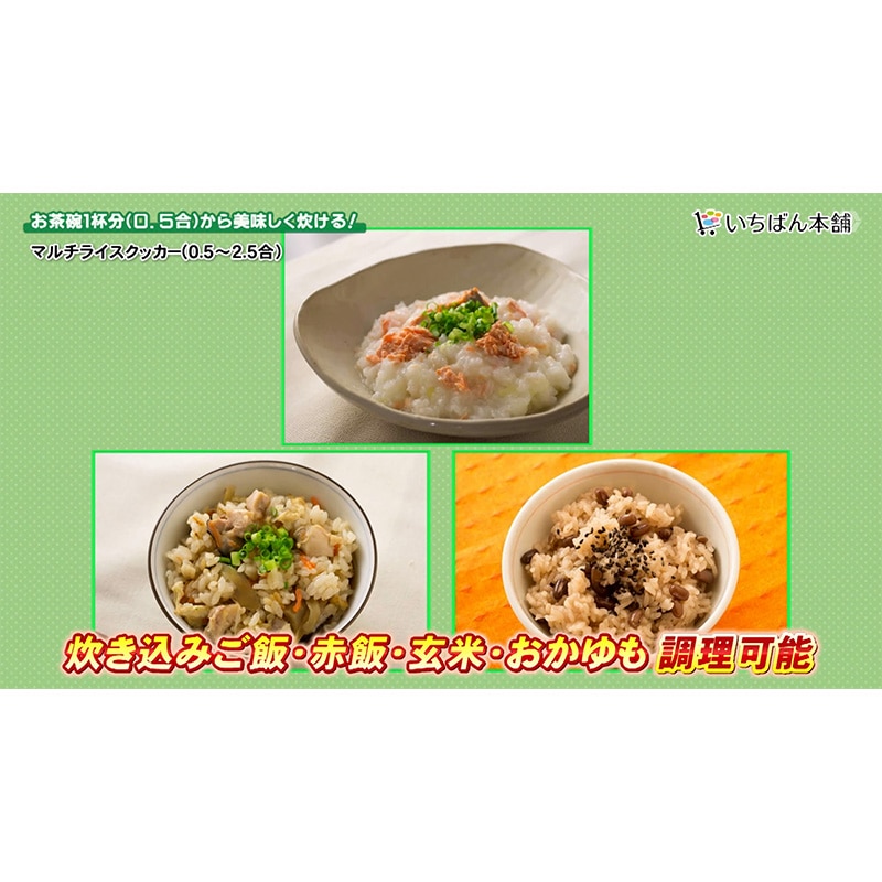 「炊いたけど食べきれずに冷凍…」「冷蔵・冷凍したごはんがパサついておいしくない…」 「大きな炊飯器で少量を炊くと、水加減が難しくてうまく炊けない」 そんな経験、ありませんか? そこでおすすめなのが、シリーズ累計14万台を突破したコンパクトな炊飯器「マルチライスクッカー」です。 マルチライスクッカーは、お茶碗1杯分(0.5合)からふっくら美味しく、食べたい分だけ炊きたてのご飯を楽しむことが出来ます。 お米をおいしく炊くために大切なのが“対流” マルチライスクッカーは、深型設計の内釜を採用。 お米と水がしっかり対流し、ムラなくふっくら炊き上がります。 炊き立てのごはんはツヤツヤで、香りも豊か。 冷凍ごはんとは一味違う、炊き立ての感動を味わえます。 本体はわずか約1.6kgと軽量。ハンドル付きで移動もスムーズです。 おひつのように食卓へそのまま持って行けるのも嬉しいポイント。 内ふたは取り外して洗え、内がまはセラミックコーティングを施しており、お手入れも簡単です。 「炊く」はもちろん、「煮る」「蒸す」「焼く」「発酵」「温め直し」までこれ1台でOK。 白米、玄米、炊き込みごはん、おかゆ、赤飯など、幅広いメニューに対応しています。 さらに、写真付きのレシピブックも付属しているので、材料を入れてボタンを押すだけで本格料理が完成! 煮物、スープ、デザートなど、毎日の食卓がもっと手軽に、もっと豊かになります。