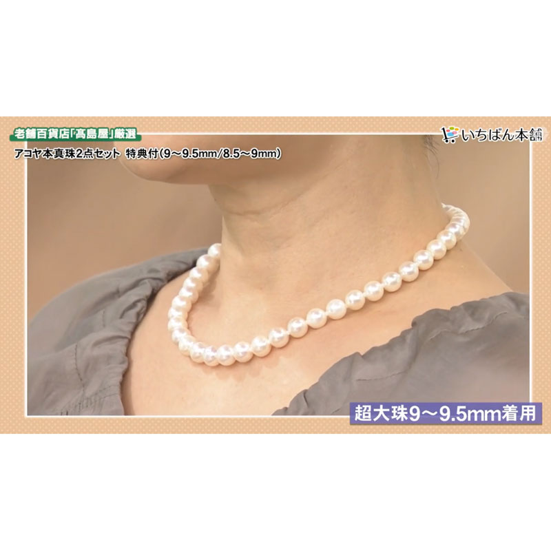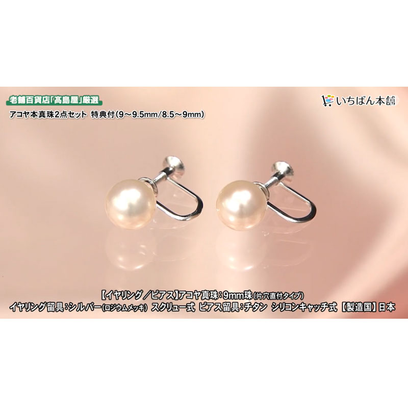老舗百貨店・髙島屋が品質にこだわった、国産アコヤ本真珠の特別セット。 ネックレスとイヤリング(またはピアス)を、いちばん本舗のために特別価格でご用意しました。 近年、海の環境変化や海外需要の高まりにより、国産アコヤ真珠は年々希少に。 特に大珠サイズは入手が難しくなり、価格も高騰しています。 そんな中、国内有数の産地から、テリ・巻きともに優れた美しい真珠を確保しました。 ■超大珠 9-9.5mm 存在感のあるボリュームで、胸元を一気に華やかに。 店頭でもなかなか出会えない希少サイズです。 ネックレスは定番の42cmプリンセスサイズ。 ワンプッシュ式の留め具で着脱も簡単。 イヤリング・ピアスは真珠が耳元に上品にフィットする直付けタイプ。 フォーマルな場面にも安心してお使いいただけます。 さらに今回は、普段使いにも便利なアコヤ本真珠ペンダントを特典としてお付けしました。 冠婚葬祭はもちろん、入学式・卒業式・結婚式などのセレモニーに。 また、日常の装いに取り入れるだけで、上品な華やかさをプラスします。 大切な方への贈り物にもおすすめです。 髙島屋クロスメディアがいちばん本舗のためにご用意した特別企画。 この機会をぜひお見逃しなく。
