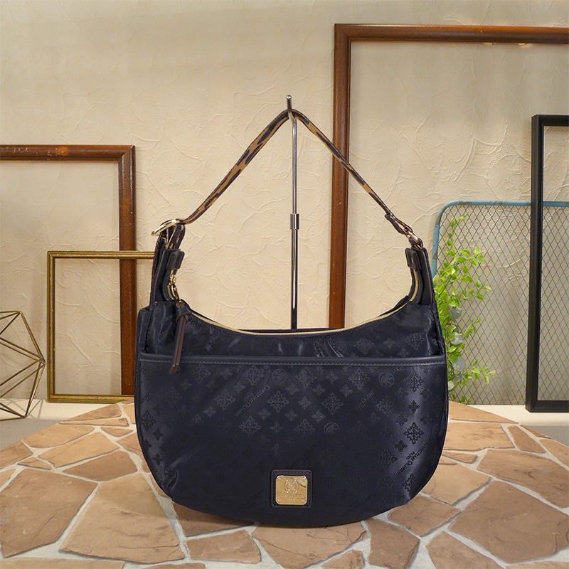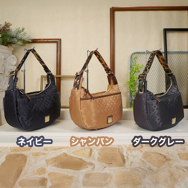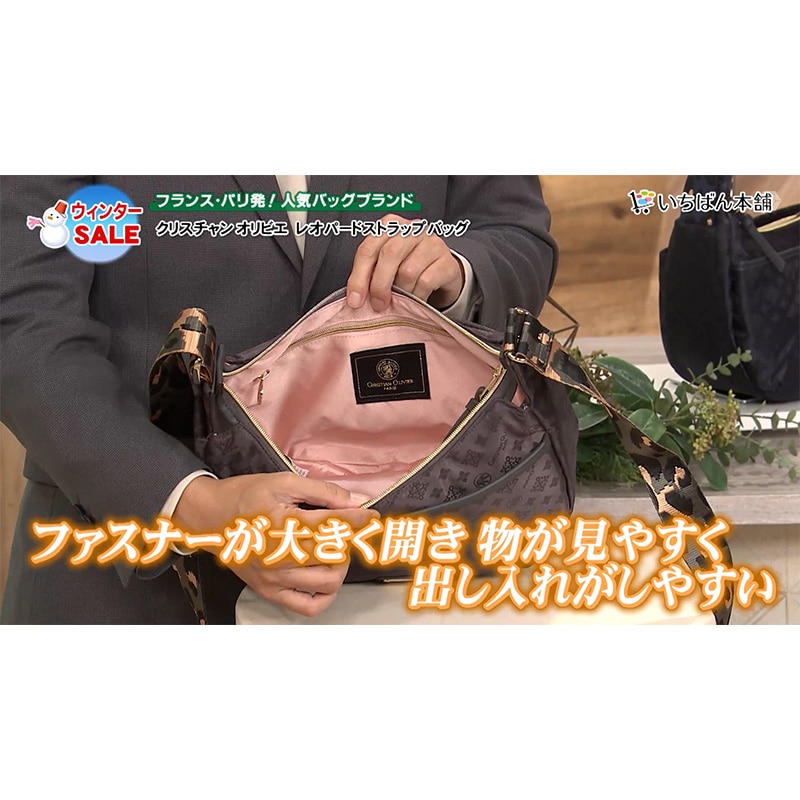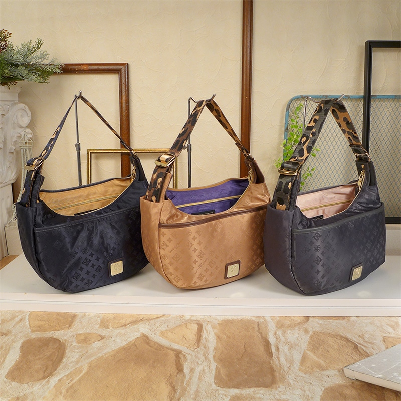 フランス・パリ発のブランド「クリスチャン・オリビエ」から、上品さと機能性を兼ね備えたバッグのご紹介。 生地には、クリスチャンオリビエのトレーマークである、ユリの花のモノグラム柄のジャガード織を使用。 ジャガード織ならではの立体感による陰影が上品で、高級感のある光沢感を演出してくれます。 はっ水加工も施されているので、雨や汚れにも強くお手入れも簡単です。 重さは、約450gと軽量。 ショルダーストラップは、太めのデザインで長時間持っていても疲れにくく、長さは無段階で調整可能。 ハンドバッグから斜め掛けのサイズまで調整可能です。シーンに合わせて、使い分けでき幅広いシーンで活躍します。 ショルダーストラップには、レオパード柄を使用。アクセントとなり、カジュアルな装いにも華やかさをプラスします。 ラウンド型の丸みある柔らかな形で、マチ部分に立体感を持たせる工夫がされているので、見た目以上にしっかり荷物が入ります。 メイン開口部のファスナー部分は、柔らかいカーブを描くようにデザインされているため開閉しやすく、しっかりと開くので出し入れもスムーズ。 メイン内部にはファスナーポケットが1つ。 前側には、マグネット式のポケット。中にはオープンポケットが1つ、ナスカン付きキーリングで鍵やICカードの管理にも安心です。 後側(身体側)には、服などにひっかからないよう段階ファスナー仕様になっています。長財布もしっかりと入る大きさです。