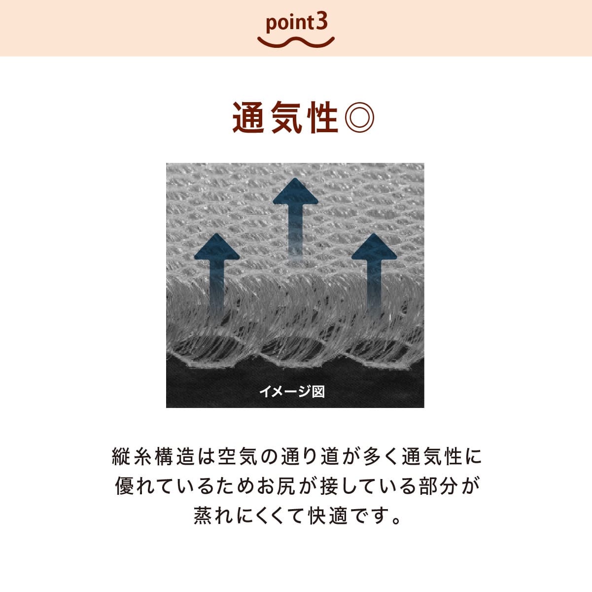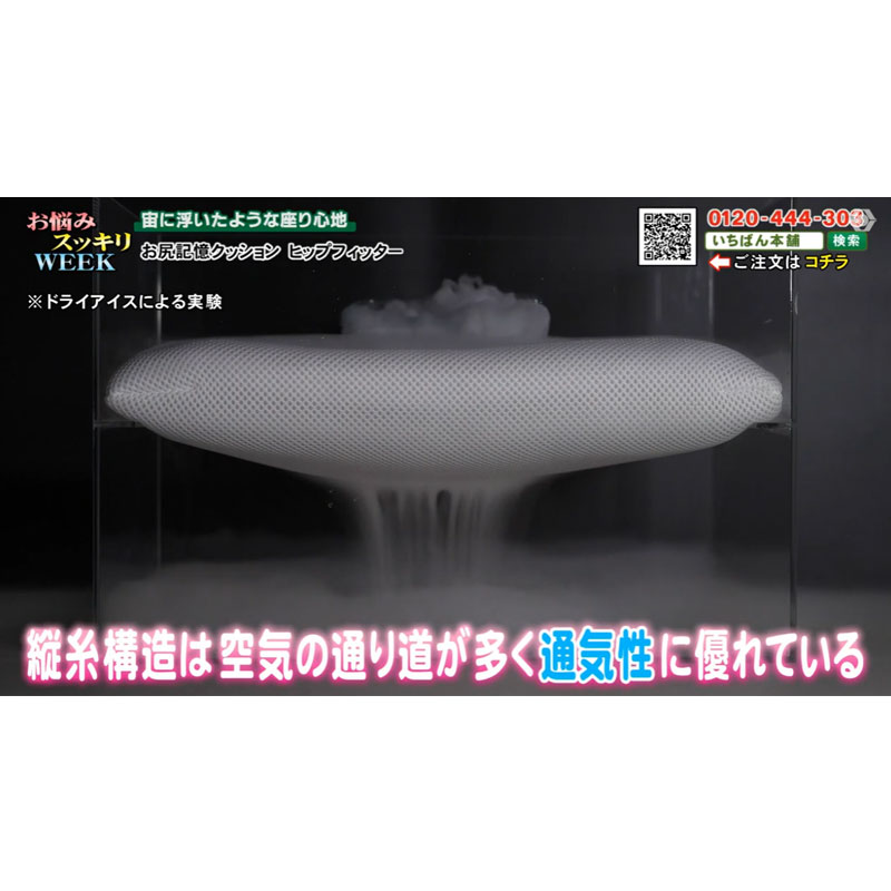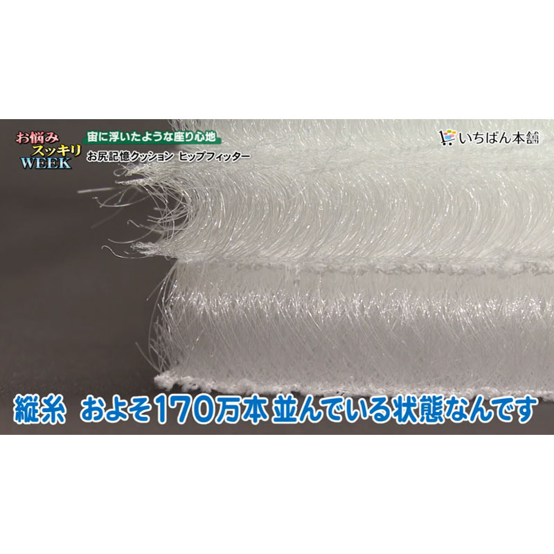 家や職場で、長時間、イスに座り続けていると、お尻や腰が痛くなった、という経験のある方は多いと思います。そんな時におすすめのクッション「ヒップフィッター」! ●縦糸5層構造でお尻に、しっかりフィット。 ●通気性に優れているので、長時間、座っていても蒸れずに快適。 ●洗濯機で丸洗いOK & そのまま乾燥機OK。 ●素材の性質上、熱を加えることで、ふっくら感が復元。 ●日本製 縦糸5層構造でお尻にフィットする、日本製のクッション。 中材は糸を編み込んで作られており、5層で170万本の縦糸が並んでいます。 一番下の層を硬めにすることにより、お尻にフィットしながらも、底つき感のない座り心地を実現。 また、この縦糸構造は、通気性にも優れているため、長時間座っていても蒸れにくく快適です。 クッションを洗濯機で丸洗い可能なうえ、そのまま乾燥機にかけることができます。 丸洗いの際は、洗濯ネットの使用をおすすめしています。 素材はポリエステル。ポリエステルはその特性上、熱を加えると元の形に戻ろうとする力が働きます。そのため乾燥機にかけると、クッションがふっくら復元します。 乾燥機にかけられない場合はドライヤーの熱風でも復元可能です。 クッションとしてお尻の下に敷くだけでなく、背もたれとして使うのもおすすめです。 ゴムバンド付きなので、背もたれなどに固定すれば、ずれにくくなります。 とても軽いので、持ち運びもラクラク。 家のイス、職場のイス、ソファー、床や畳の上など、座るとき、もたれるときに、 お尻の下や背中に「ヒップフィッター」を、ぜひ、お試しください!