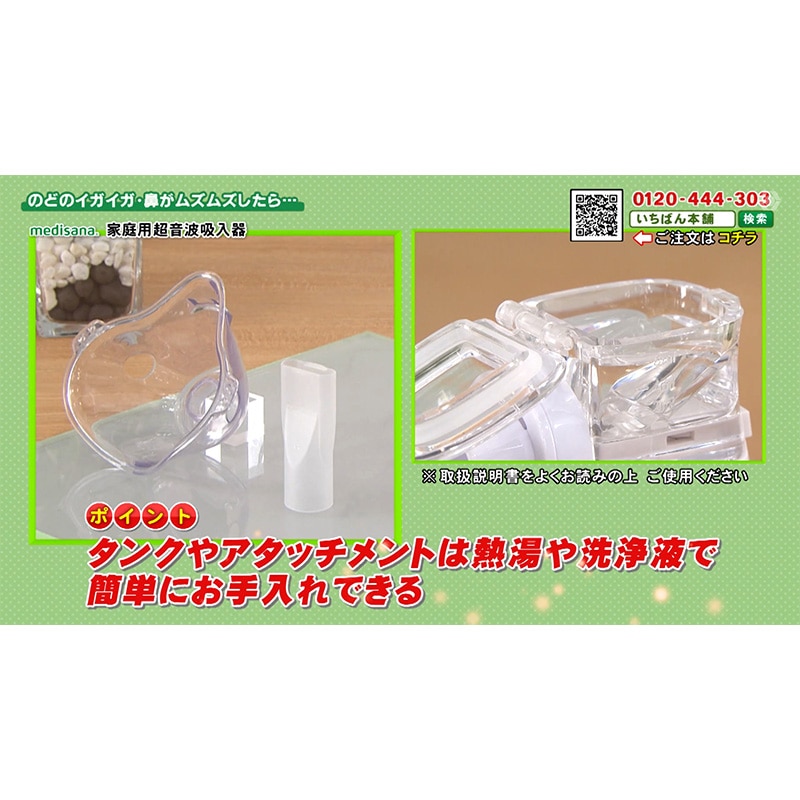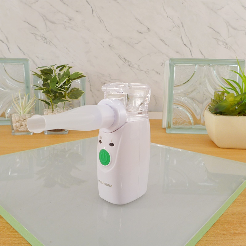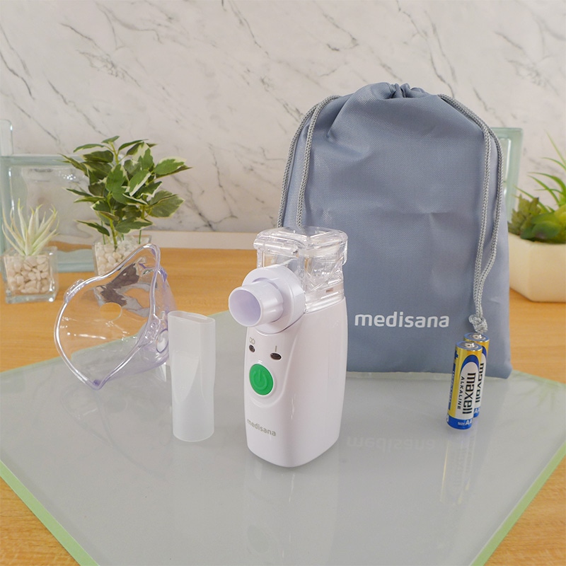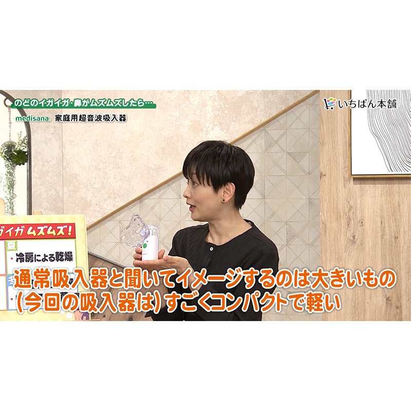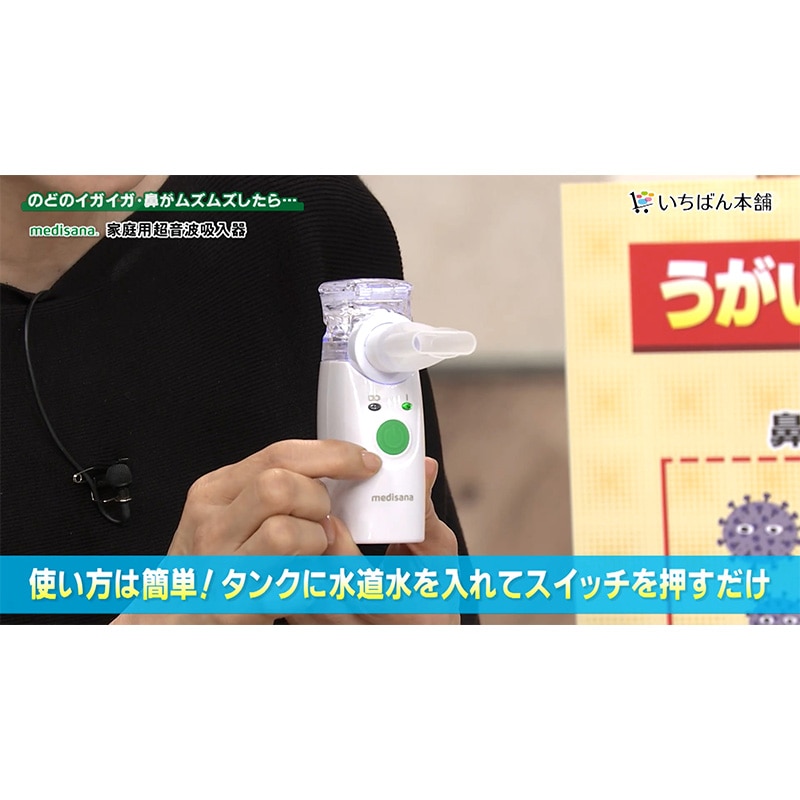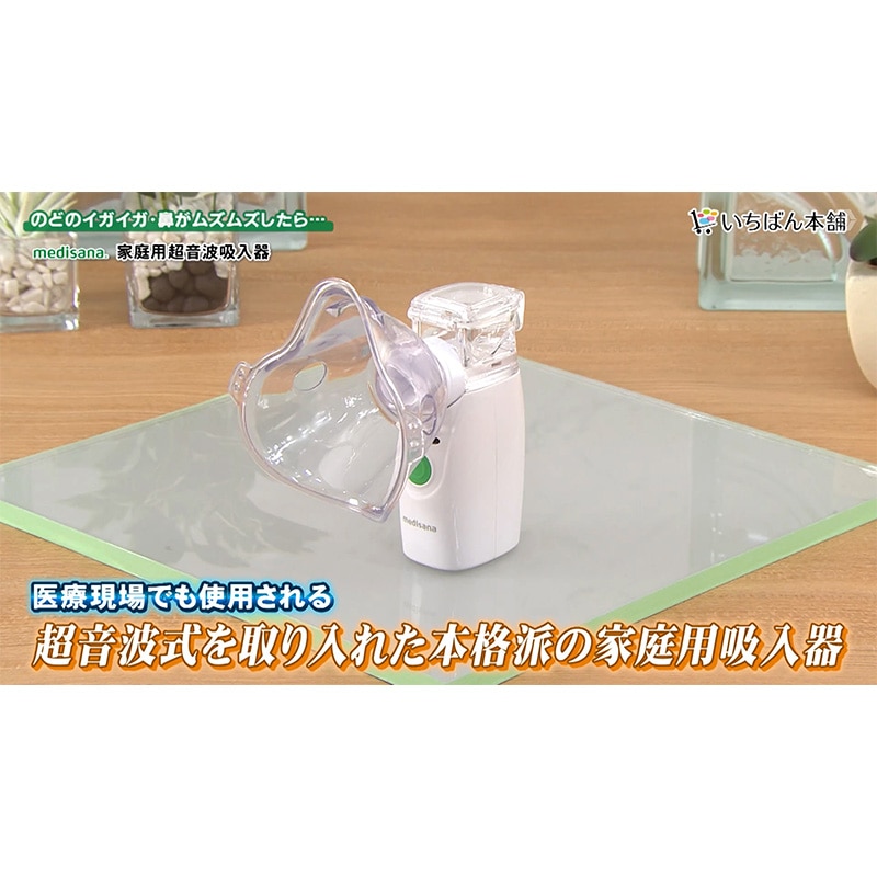 年中悩まされる喉・鼻のイガイガムズムズ対策には、粘膜にある「線毛」を常に潤しておくことが大切です。 「線毛」は、喉だと気道の内側を360度覆うように存在。 ここが乾いていると細菌やウイルスを体外に排出しづらい状態にとなりとどまったままに…。 よって喉のイガイガ対策には、喉にある「線毛」を常に潤しておくことが大切! 喉のケアとして「うがい」が一般的ですが、うがいだけでは喉の奥まで潤わせることが難しいんです。 また「水を飲み込む」ことも身体の構造上、気管が潤いきらず不十分に…。 そこでドイツの医療機器メーカー「メディサナ」が開発した吸入器の出番! 管理医療機器取得の本商品(※医療認証番号:306AKBZX00013000)は ●鼻腔と咽喉の加湿 ●洗浄による不快感の改善 という効果が認められています。その秘密は、超音波の振動で超微細ミスト。 医療現場でも採用されている超音波技術により細かく噴射された約5~20ミクロンの微小の水の粒子ミストが空気と共に吸い込むだけで、喉の奥まで潤し、うがいでは届かない喉の奥(気管含む)を加湿します。 よって喉の奥の線毛を潤し、細菌やウイルスを押し出す助けをしてくれます。アタッチメントは2種。 「マウスピースパーツ」と「吸入マスク」が付属し、吸入マスクでは口からの吸入以外に鼻からの吸入も可能に! よって、まるで鼻うがいのようなケアが可能となり、鼻の洗浄が苦手な方でも気持ちよくケアしていただけます。 今回持ち運びに便利な収納ポーチも付属し、いつでもどこでもご使用可能!音も静かで心地よいケアがいつでも体感いただけます。
