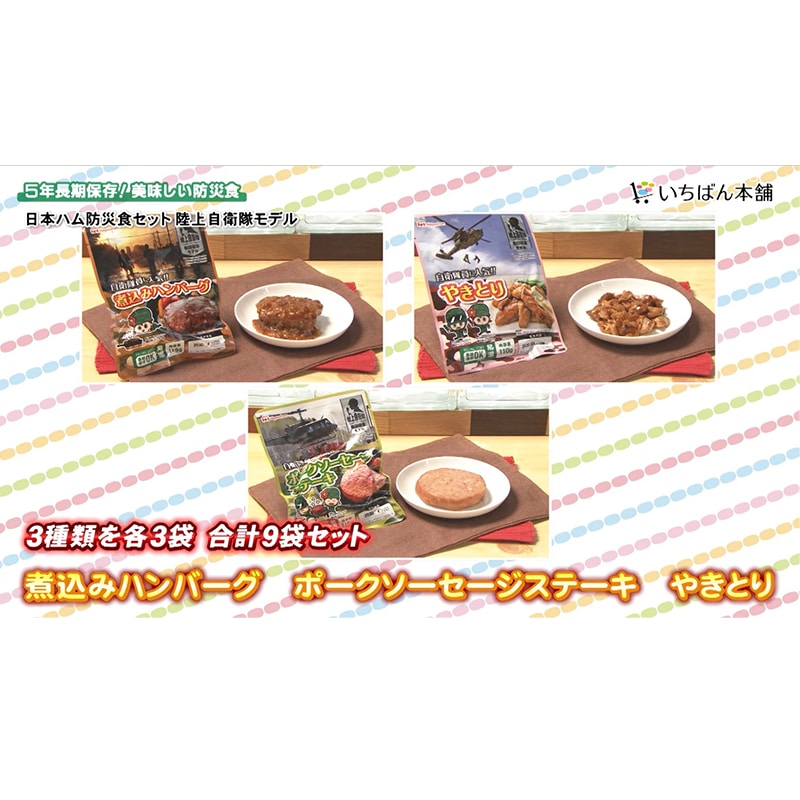 陸上自衛隊の携行食をアレンジした、長期保存が可能な「防災食」オリジナルセット!「これ、防災食?」と驚くこと、間違いなし!日本ハム防災食セット 陸上自衛隊モデル 9袋セット+特典1袋(3種×3袋+1袋)